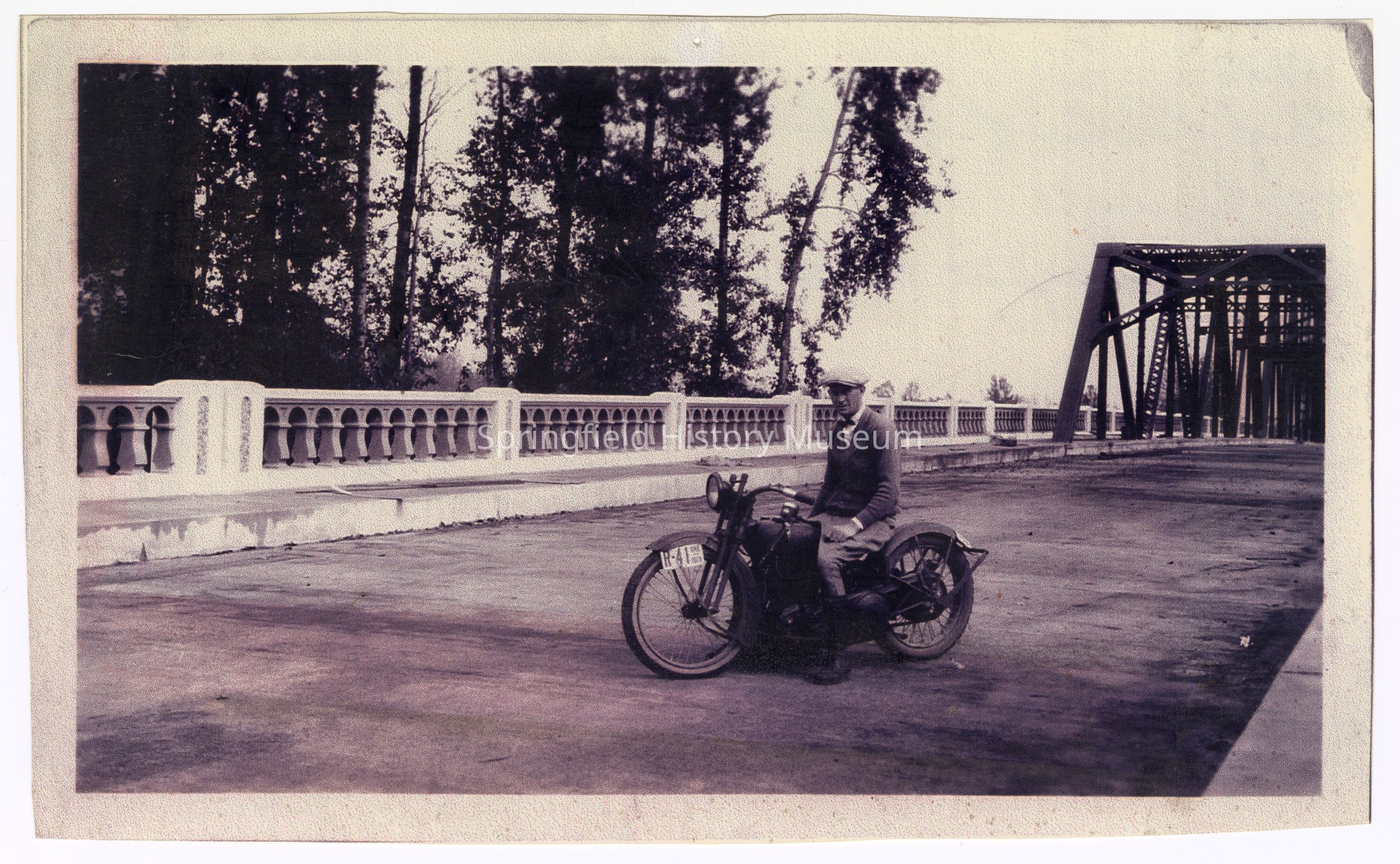 Photograph of Bill Davis on his motorcycle, first ride over a new bridge, Springfield, 1926Entry/Object ID