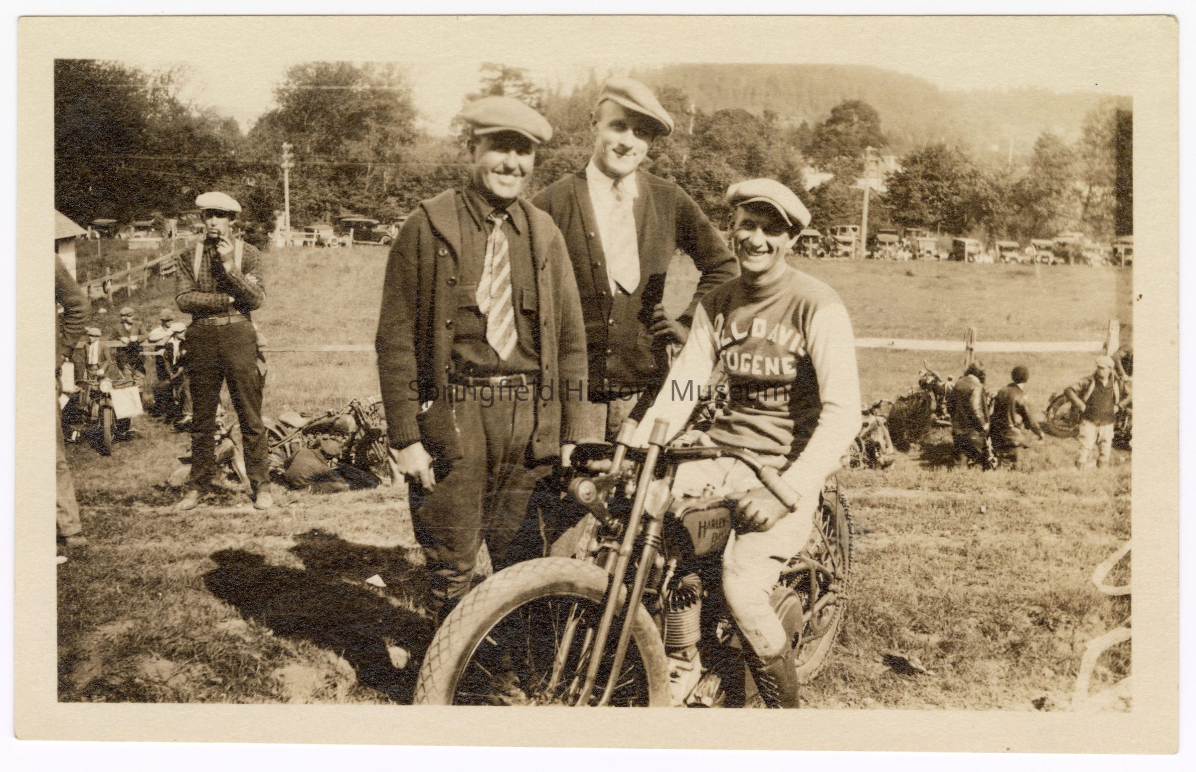 Photograph of motorcyclist Bill Davis posing with others, 1928.; Inscription back: “Bill Davis 1928”, “93”Lexicon