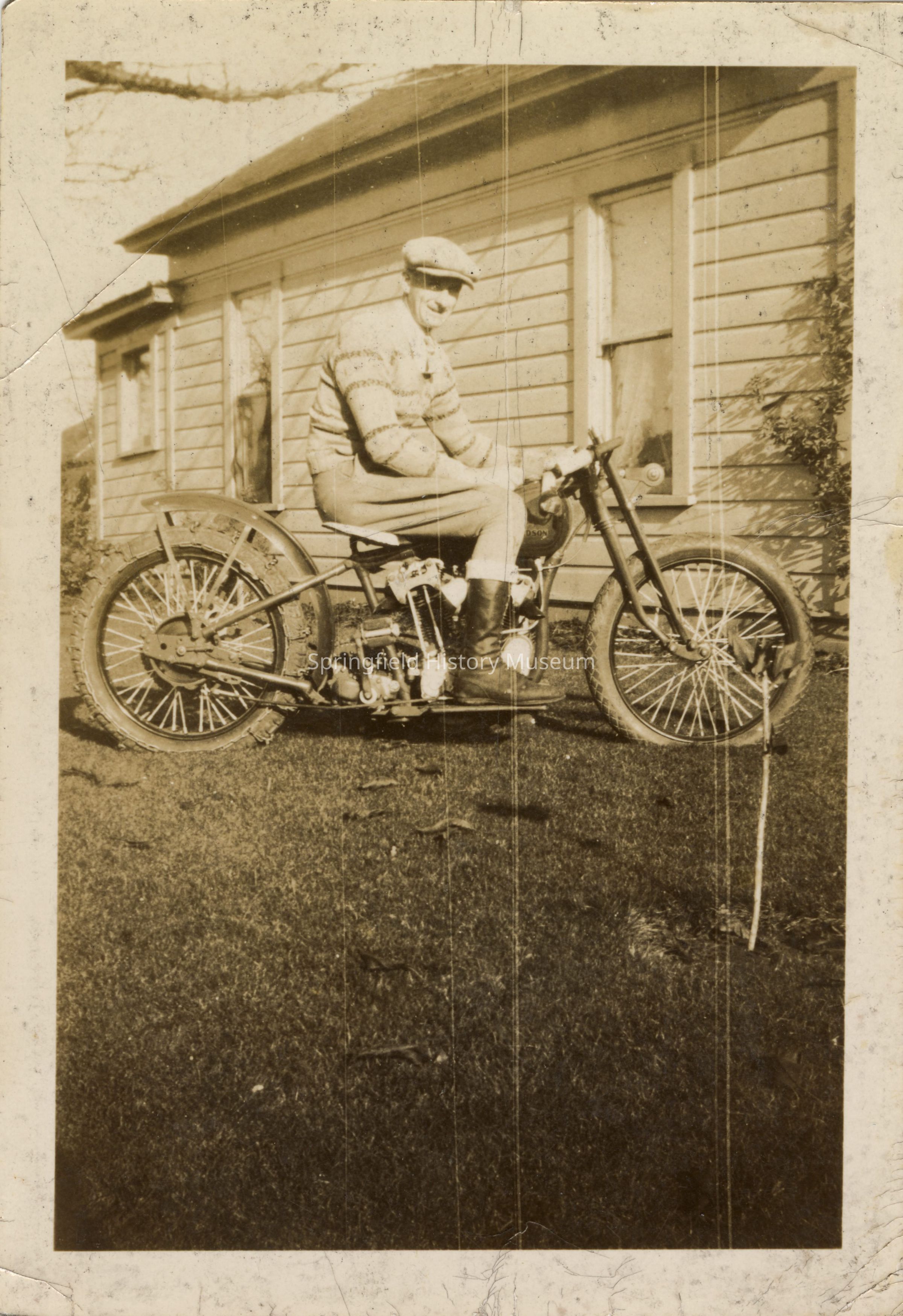 Photograph of Bill Davis senior and his motorcycle, circa 1920-25Entry/Object ID