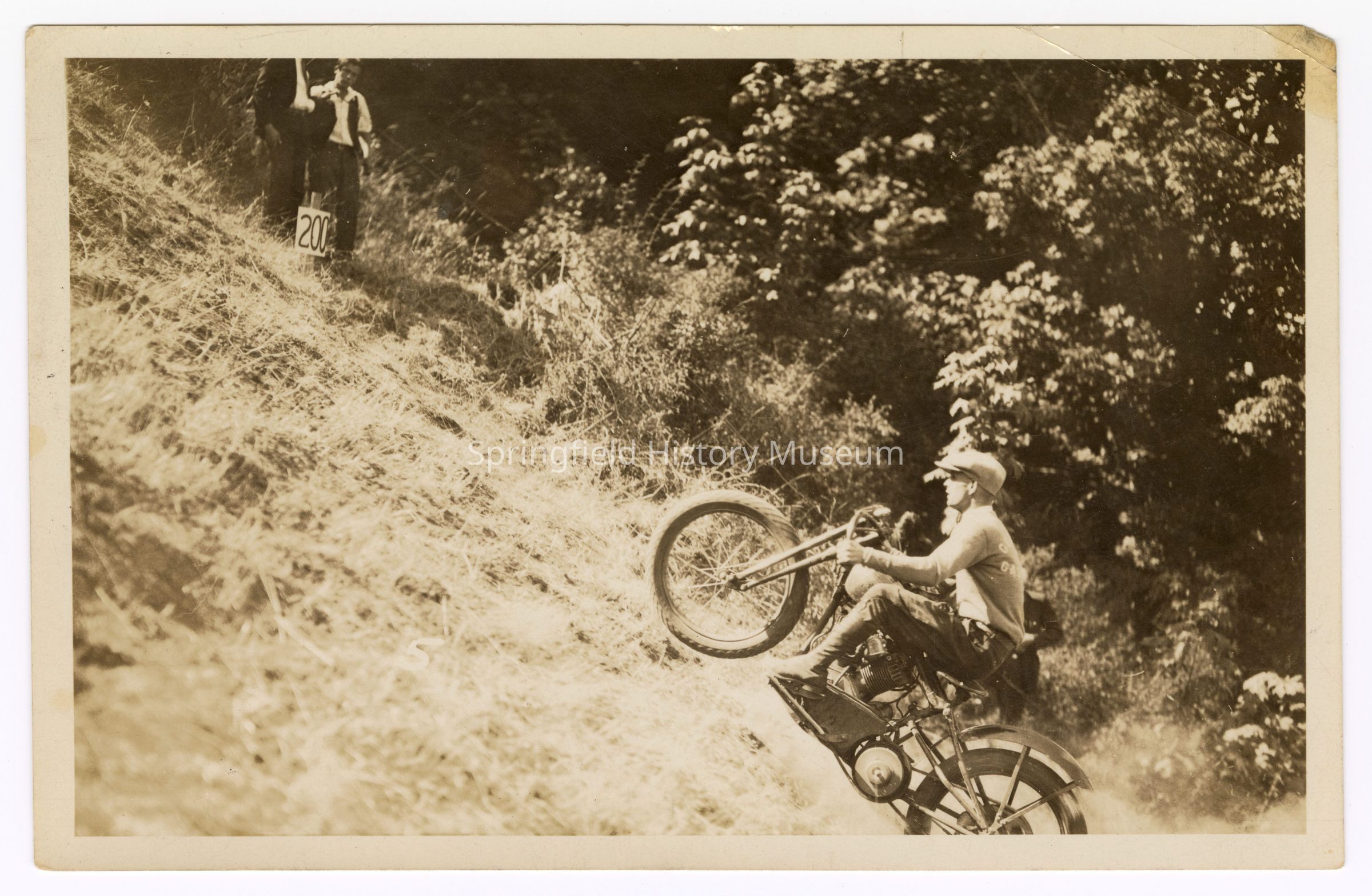 Photograph of Bill Davis senior riding a motorcycle on a hill climb, undated; Inscription back: “Bill Davis senior.” “16”