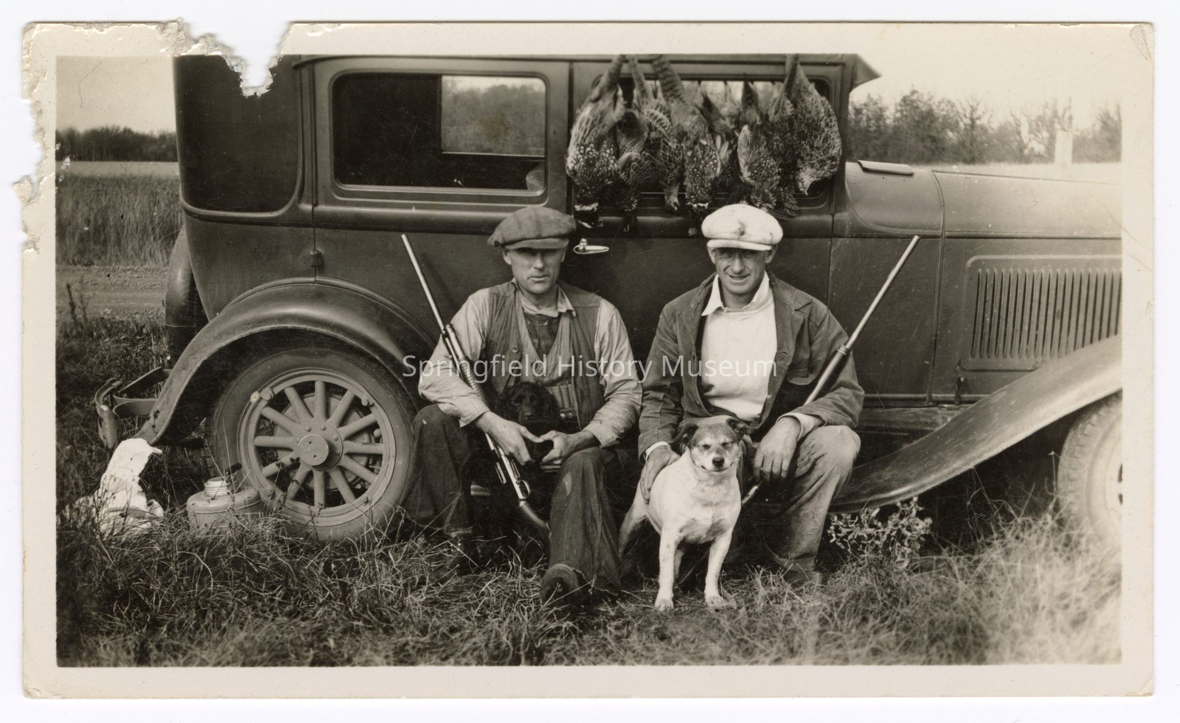 Photograph of Bill Davis senior, Smith Mountjoy and dogs, hunting trip, undated; Inscription back: "Smith mountjoy and Bill Davis."Photograph Details