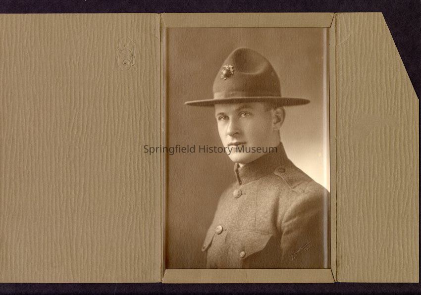 Photograph in cardboard envelope. Shows Bill Davis Sr. in Marines uniform in 1918. Hat shown is item 2023.001.001.