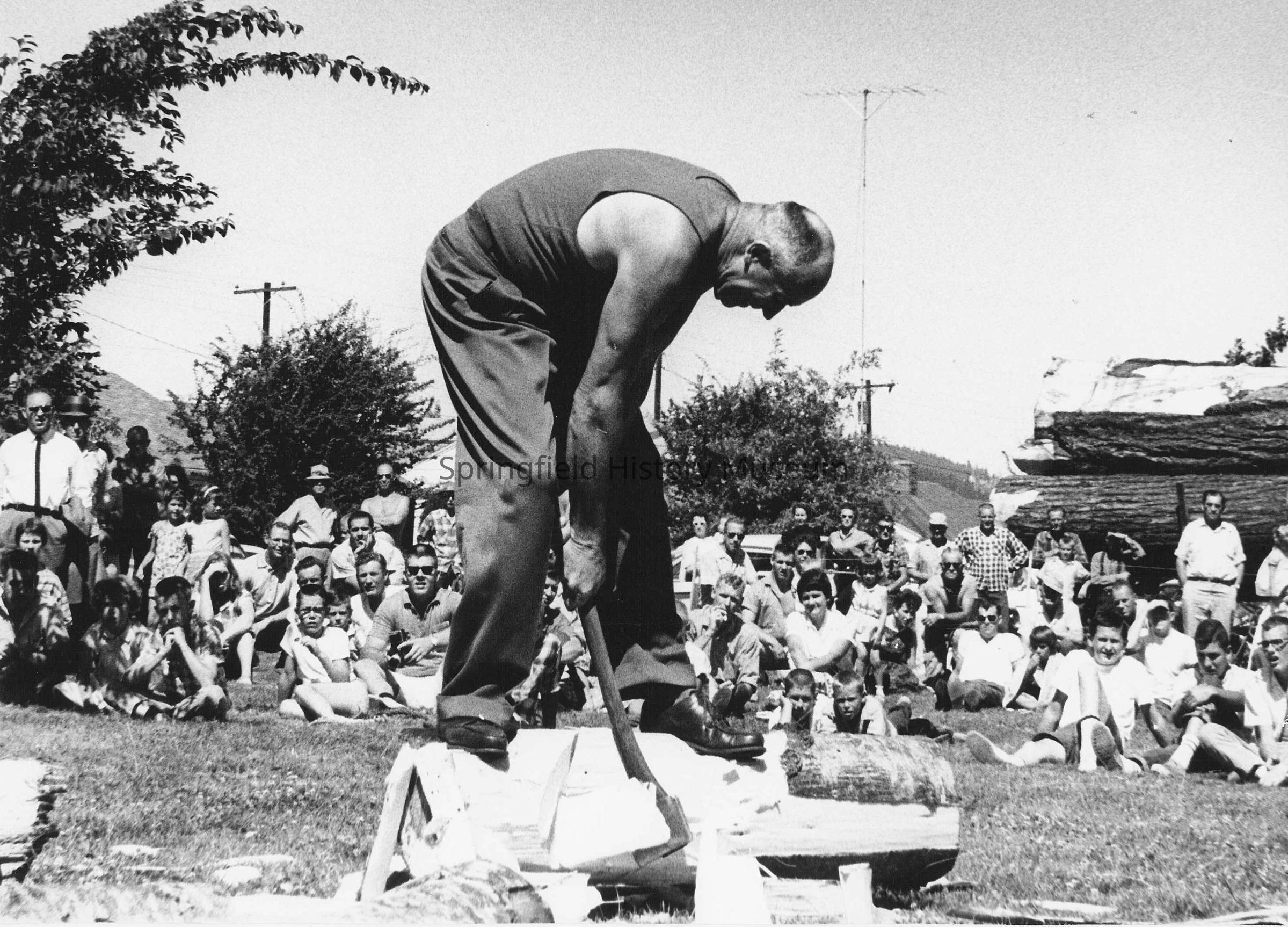 Photograph of Bill Johnston in a log chopping competition, date unknown