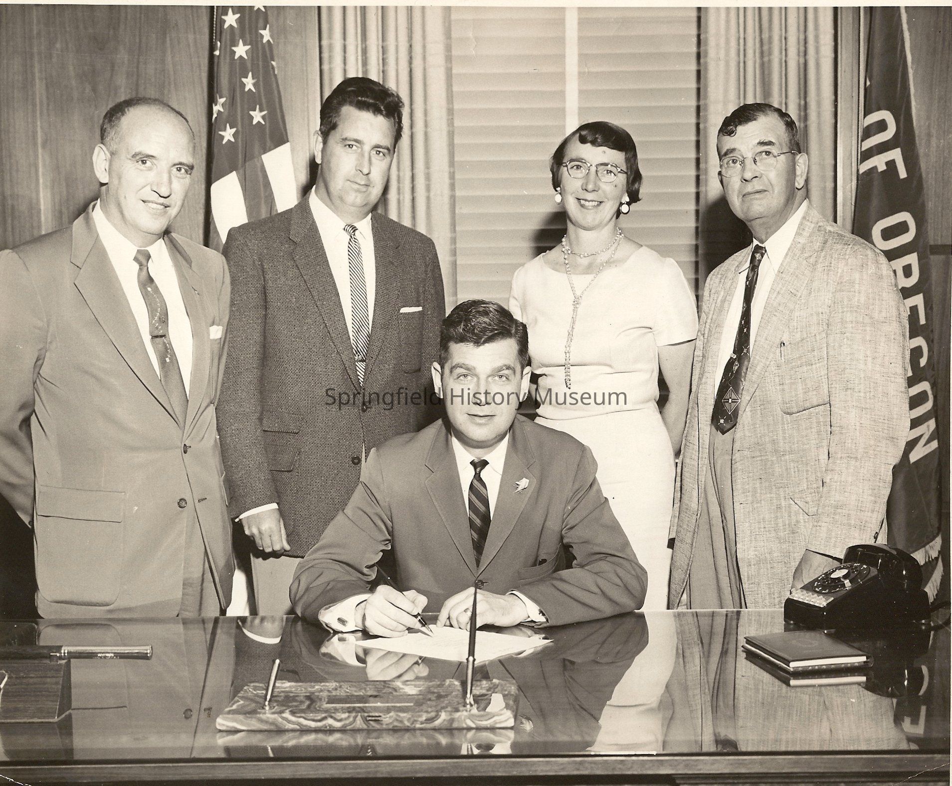 Photo of Bill Rogers, Dale Stuart, Beulah Hand, Burt Searl, Gov. Hatfield. Signing Oregon fryer legal labeling legislation.Collection