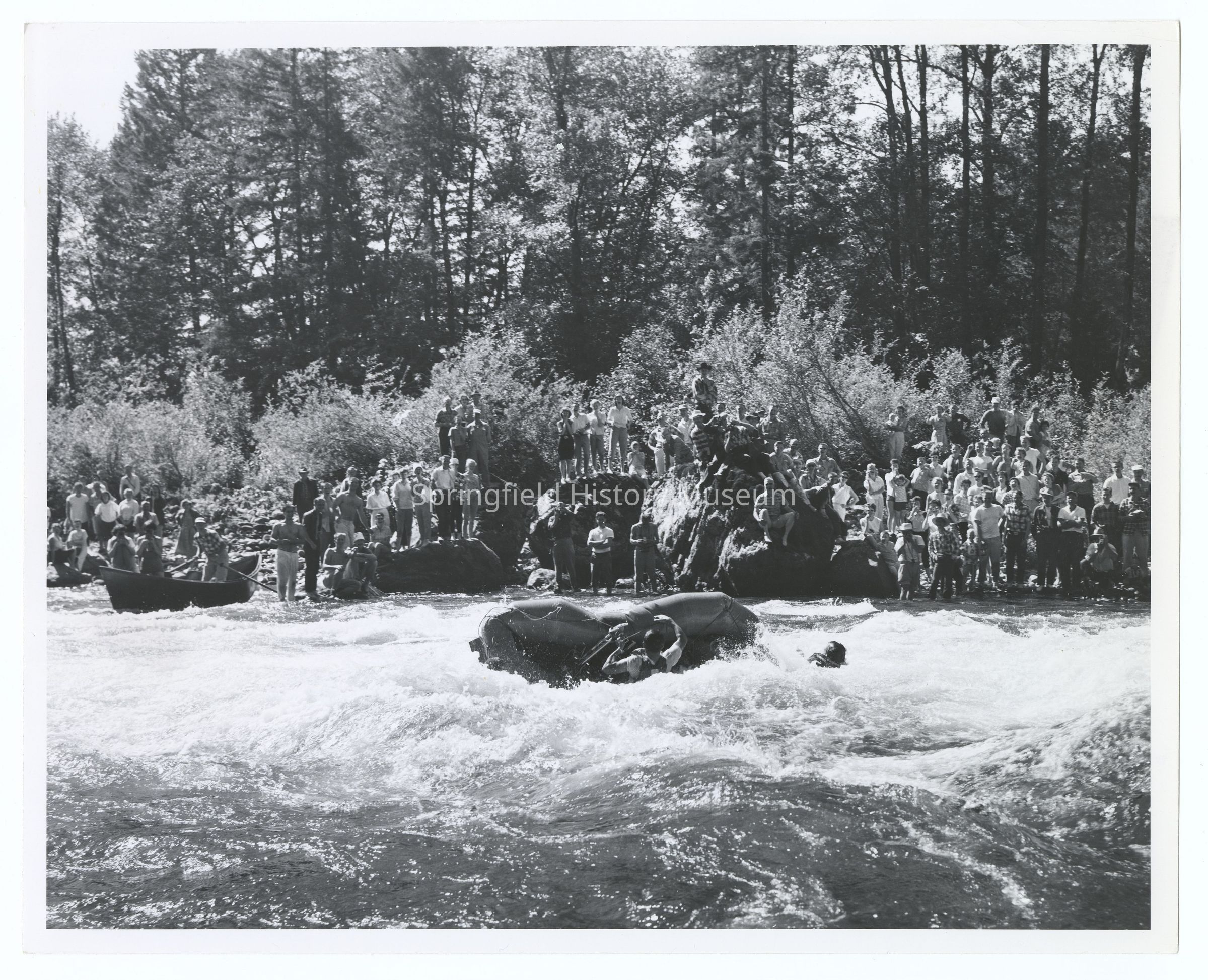 Inscription back: There's no real disaster here as these participants in the McKenzie River White Water Parade, held each spring near Blue River, Oregon fail to make it through Martin rapids, toughest stretch of water on the river. Boaters getting wet generally can make it to shore, but patrol boats are on hand just in case. The parade has never lost a customer. Oregon State Highway Commission Photo # 6477