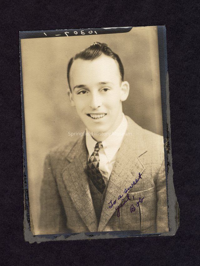 Black and white photograph of Bob Richardson. Handwritten on front is "To a sweet girl, Bob", handwritten on back is "38' Bob Richardson". Richardson was a Senior at Springfield High School in 1938.Acquisition