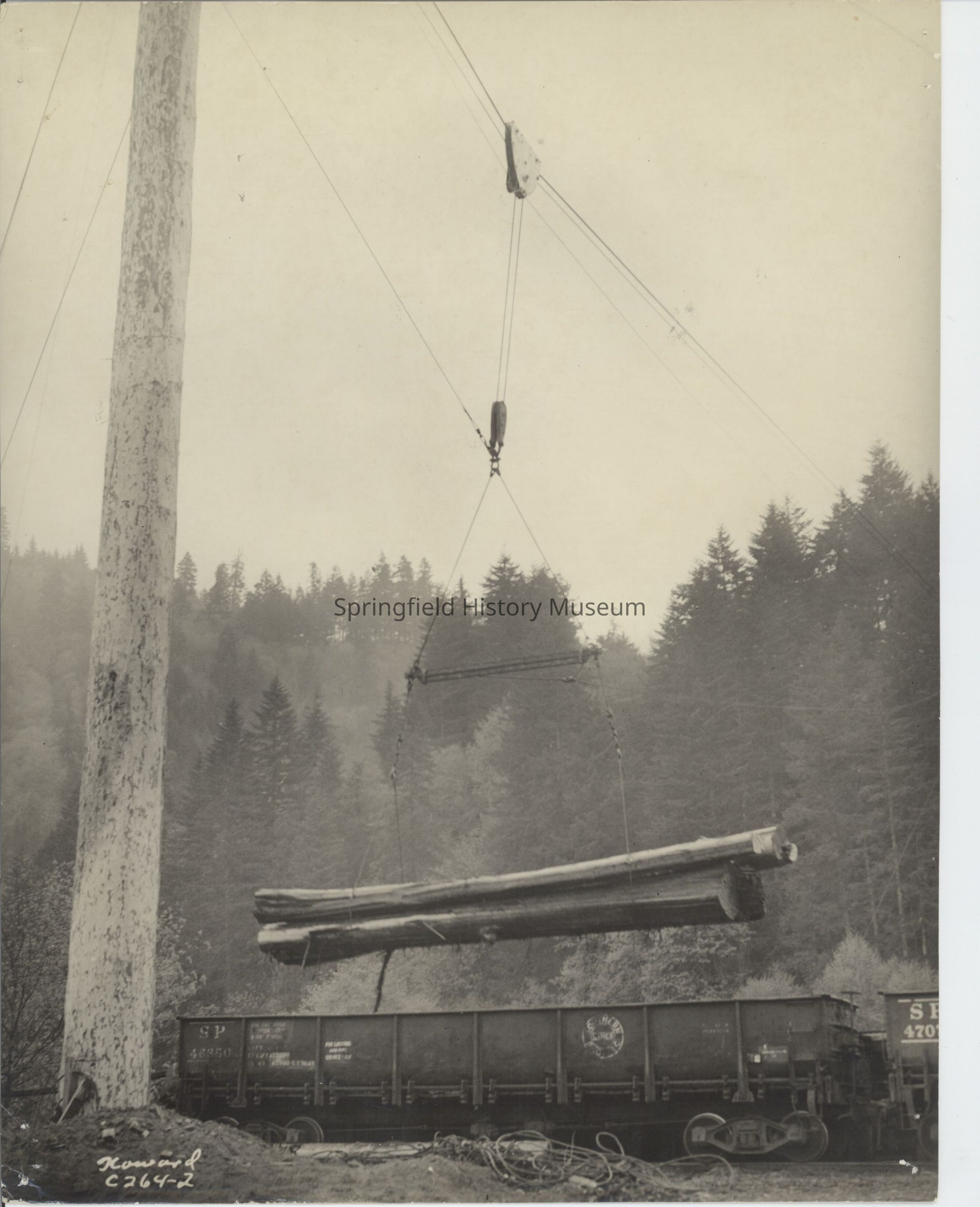 Photograph of boom pole loading logs onto train. Photo shows cables holding three or four logs. Marked on front Howard C264-2.