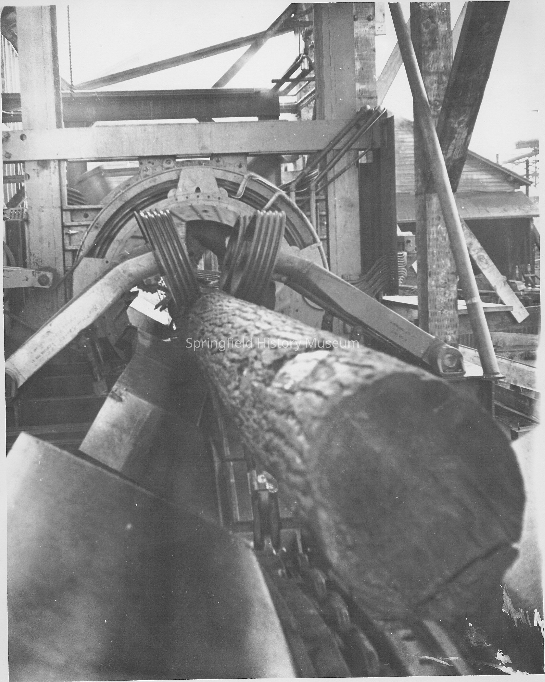Close up photo of a log in the barker at the Booth-Kelly mill during renovations in 1956.