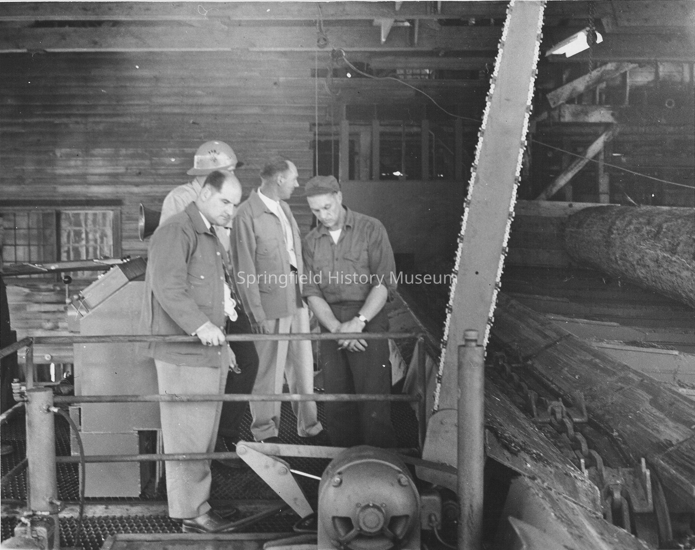 Cut-off chain saw and 4 unidentified men at the Booth-Kelly Mill, 1956.