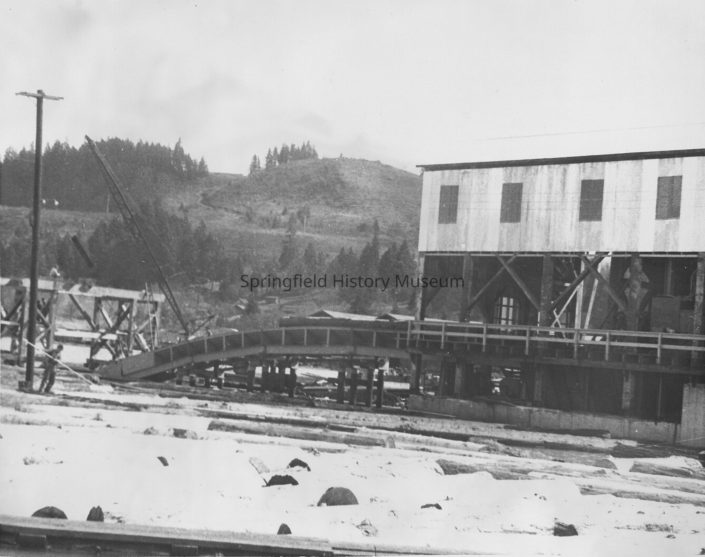 The Barker shed, conveyor and pond at Booth-Kelly mill during the renovations of 1956.