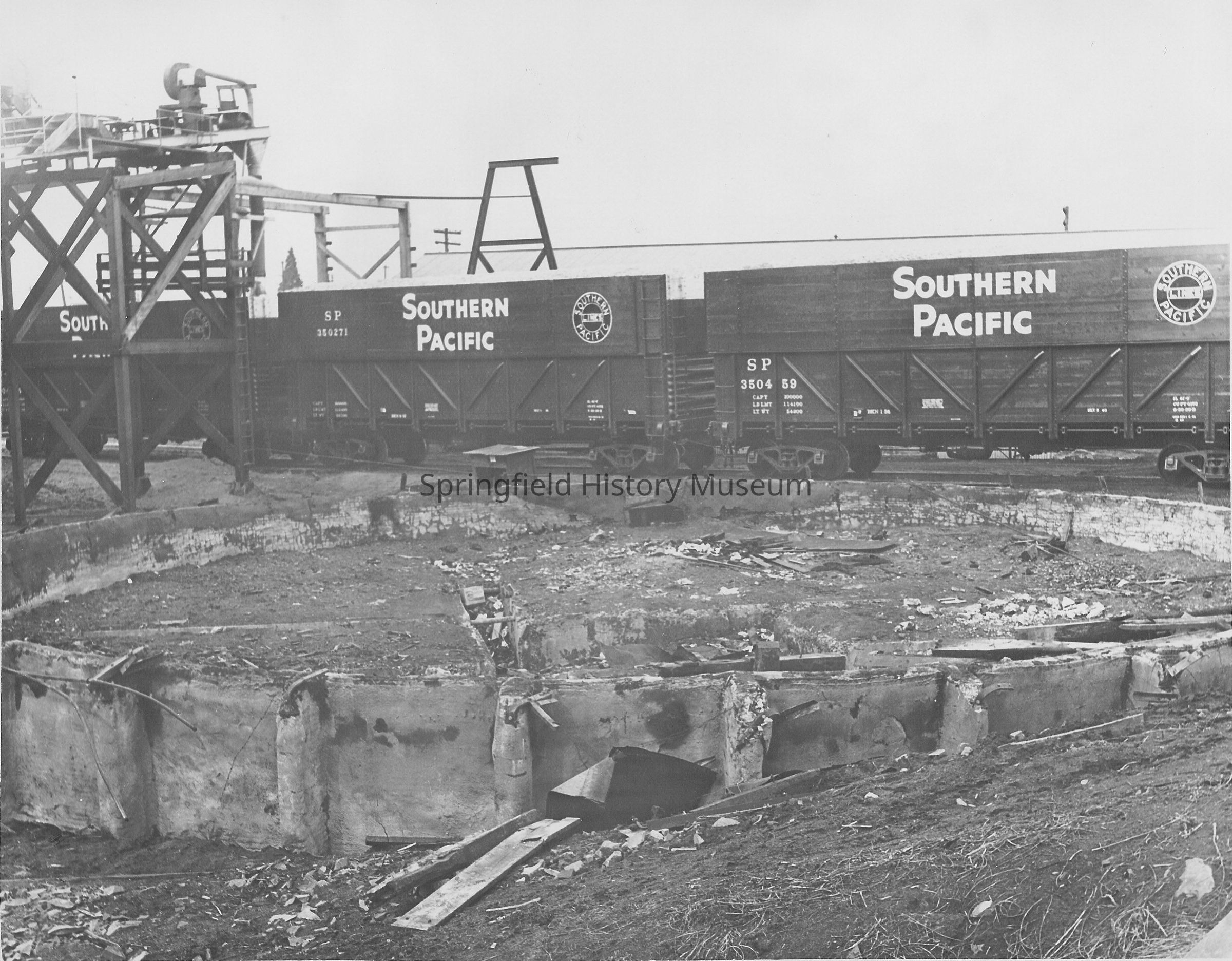 Southern Pacific chip cars and the foundation of the old burner at the Booth Kelly mill, in the foreground, 1956.