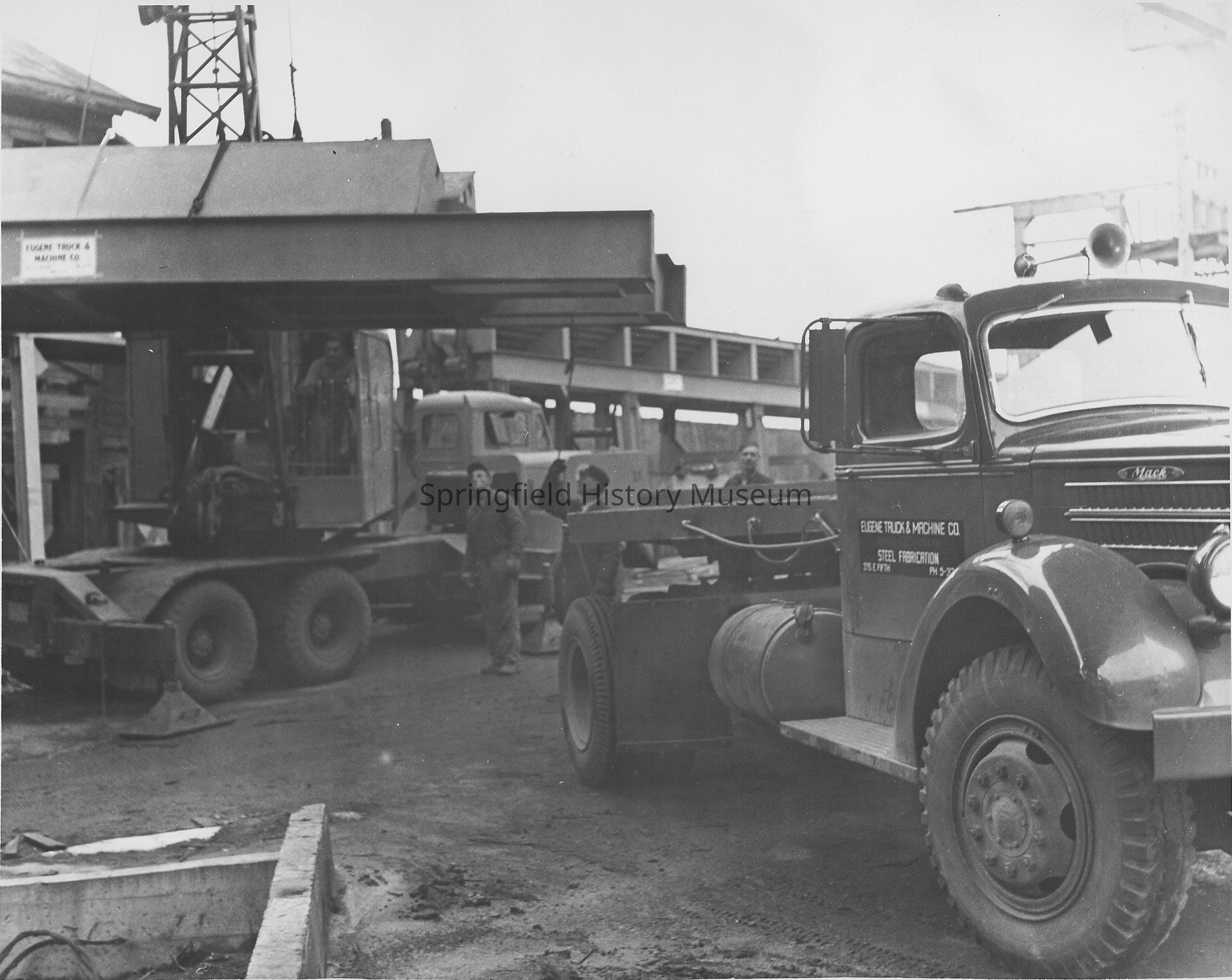 Trucks delivering materials to the Booth-Kelly mill during the renovations of 1956. Three men standing behind the Eugene Truck & Machine Company truck.