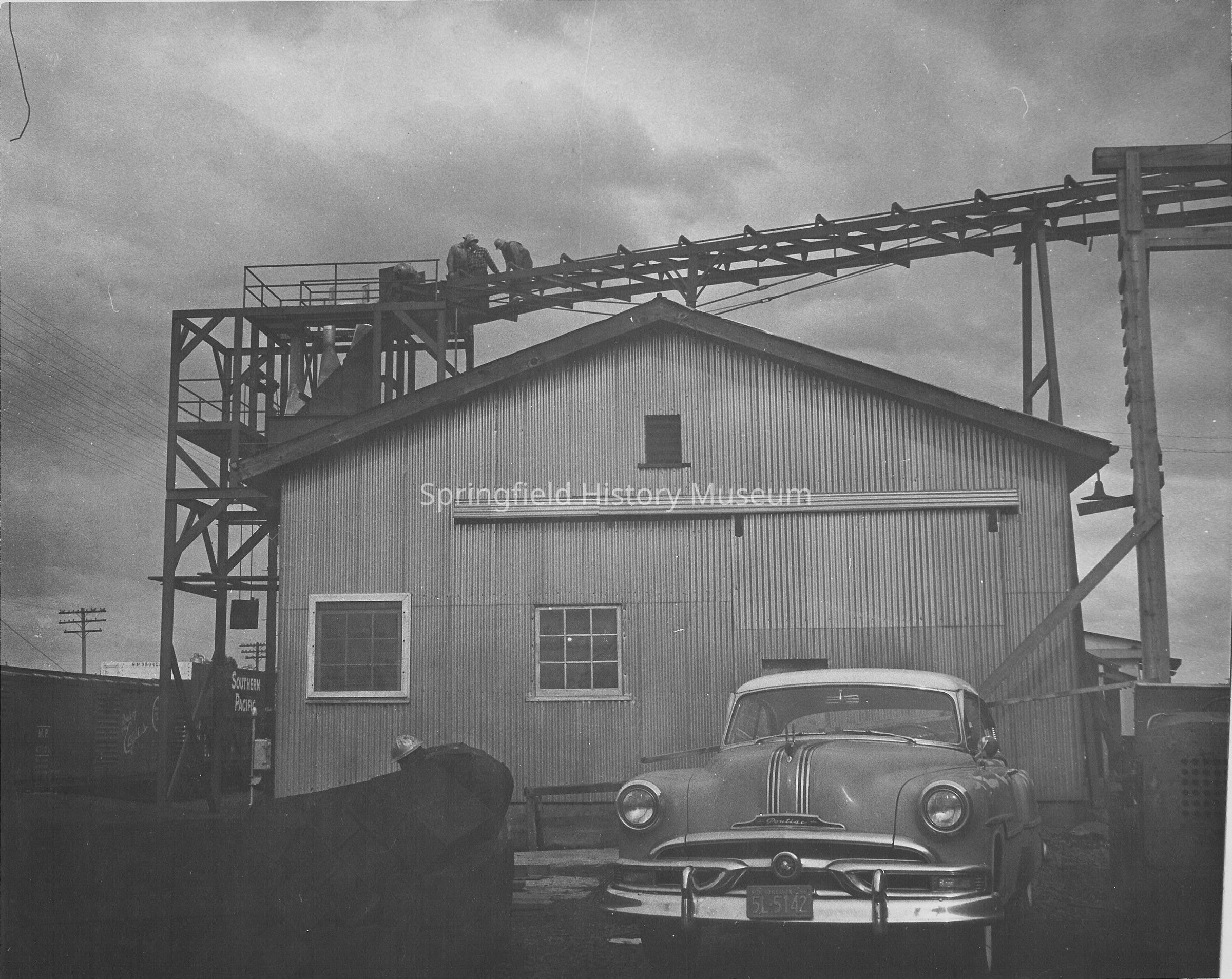 Dark photo of men, a metal sided machine shop and a Pontiac car at the Booth-Kelly mill during the renovations of 1956.