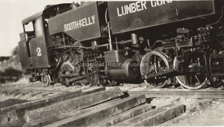 Photograph of rail engine with rail ties piled beside tracks. Engine has Booth-Kelly #2 stenciled on side. Undated