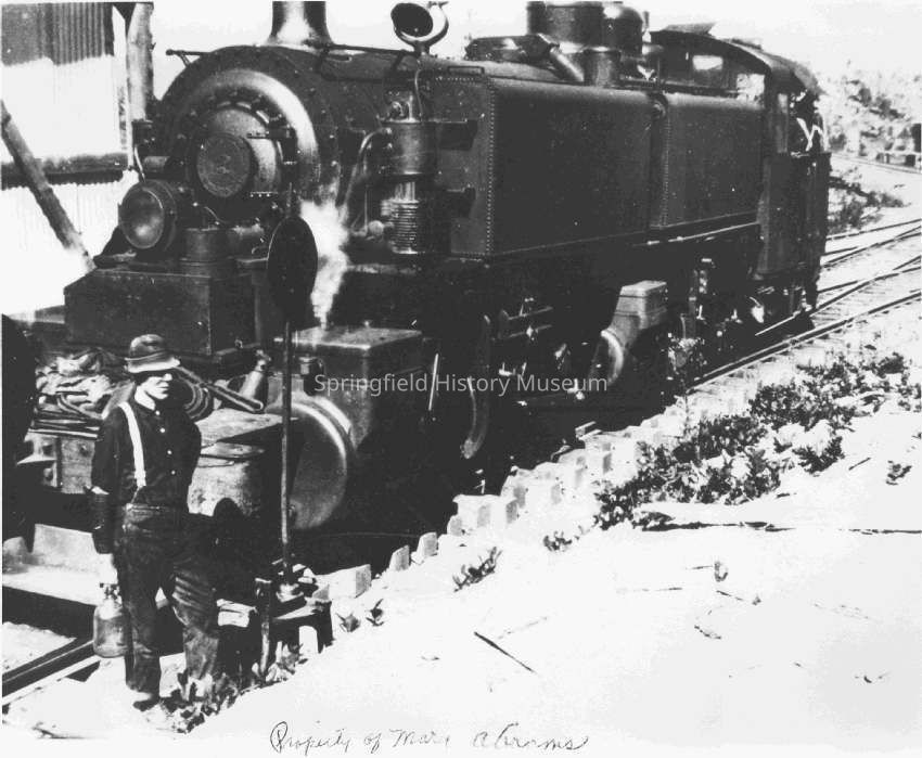Photograph of Booth-Kelly Train Engine with unidentified man standing in front, Leaburg Lake Park, OregonEntry/Object ID