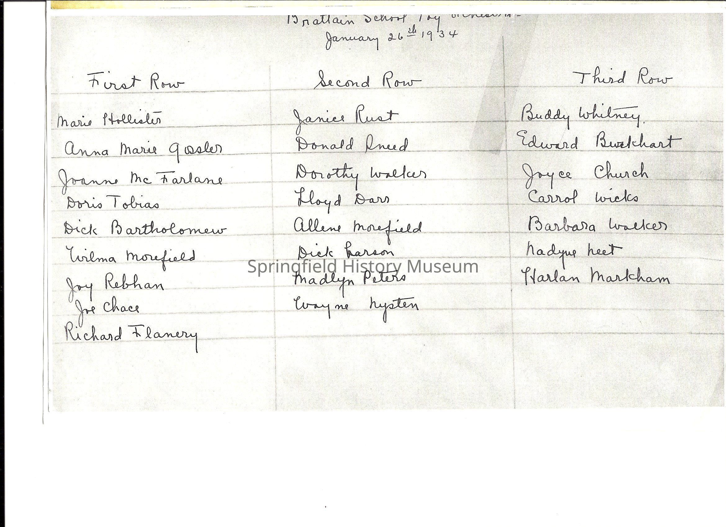 1) Photo of Brattain School Music Class . dated January 26th 1934