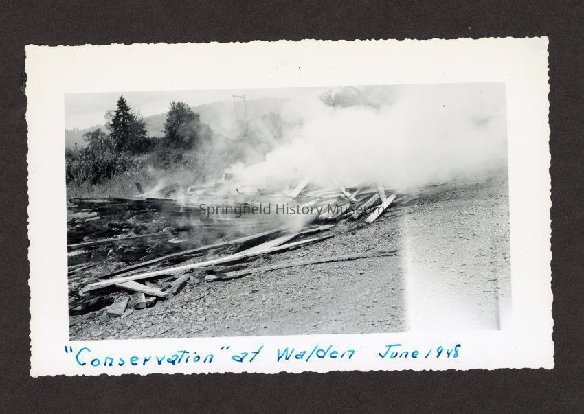 Photograph of burning wood, at bottom in pen: "'Conservation' at Walden, June 1948"