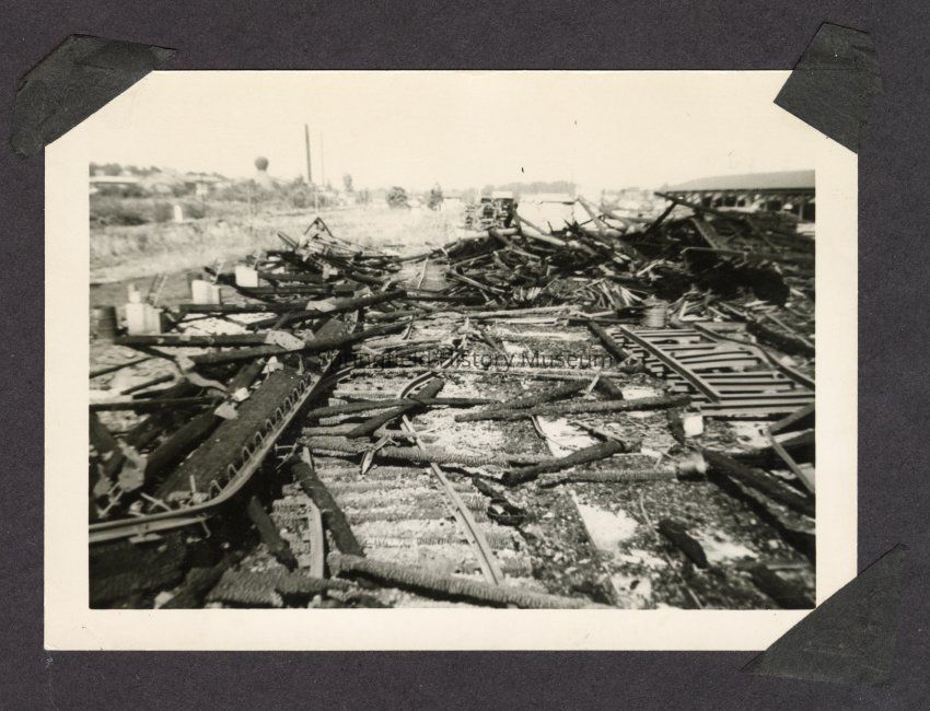 Photograph of burn wreckage of tracks at Clear Fir Mill after fire, photo taken by John and Jim Woods.