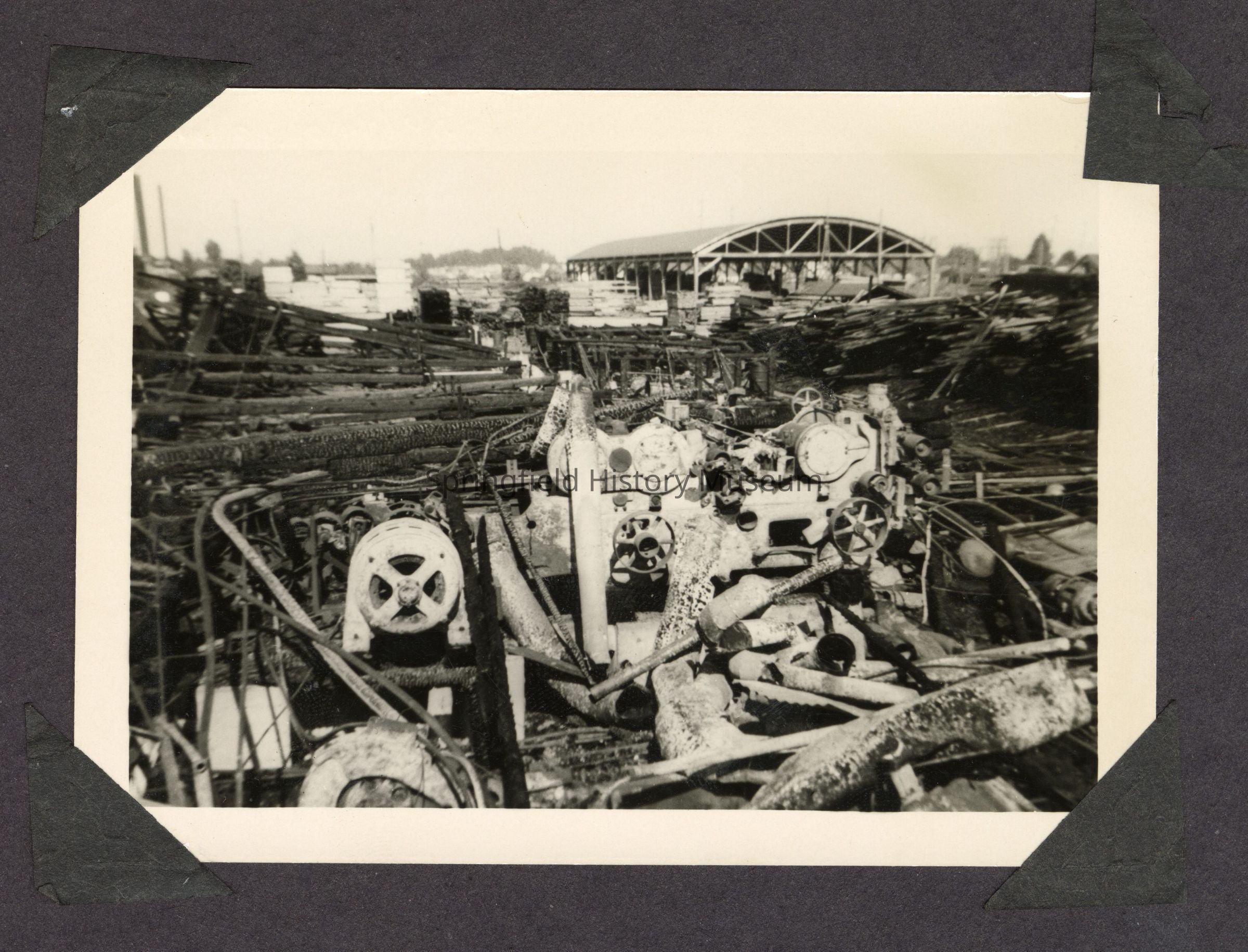 Photograph of burned machinery and lumber at Clear Fir Mill after fire (shown in 2014.002.061). Photo taken by John and Jim Woods.