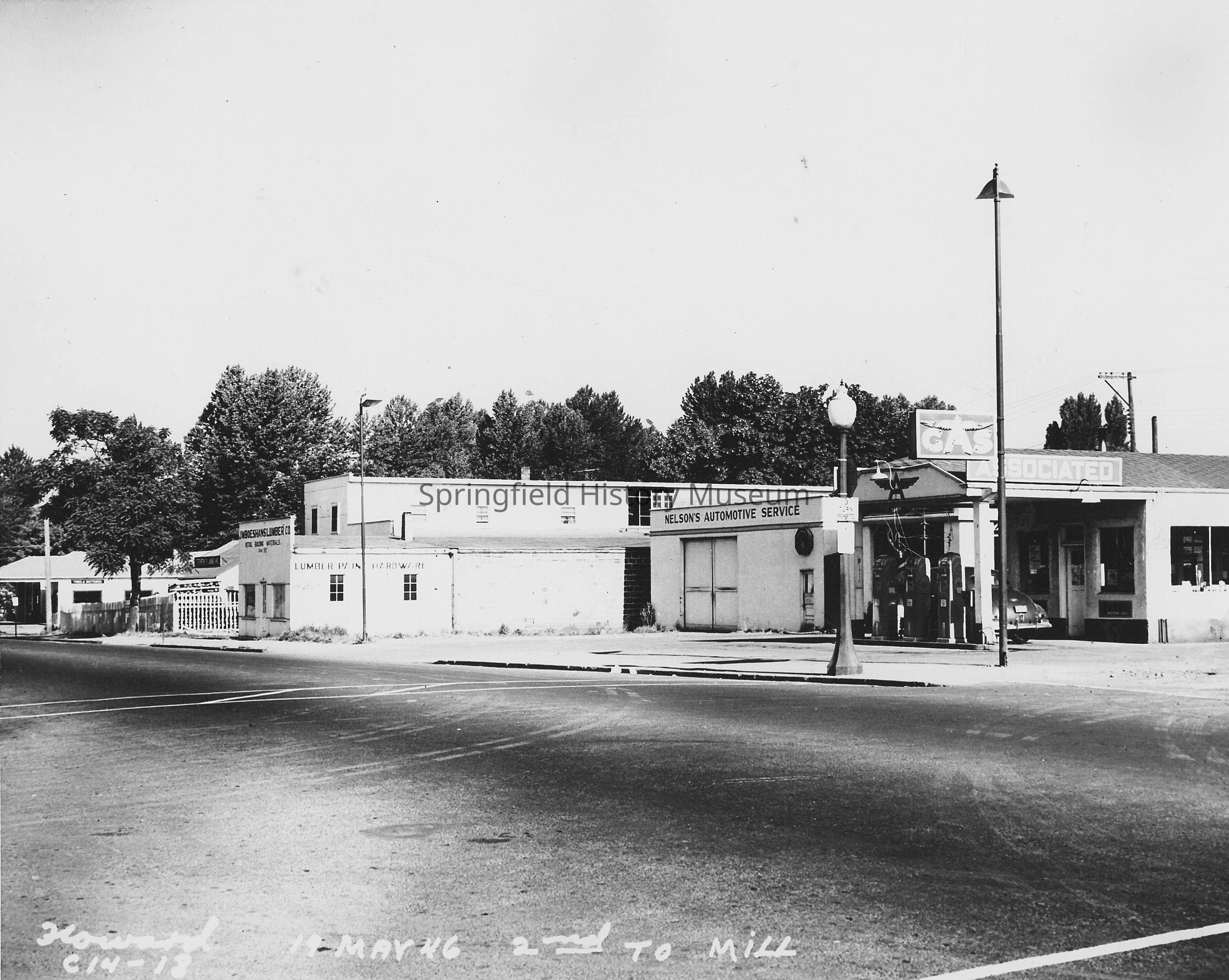 Business & Industry, Street Views, Main Street, Mill Street, 2nd Street, Associated Gas, Nelson's Automotive Service, J.W. Boeshans Lumber Co., Lumber Paint Hardware, Goeshans, Street Views, Howard C14-18, Springfield--Streets--Main Street, Springfield--Streets--Mill Street, Springfield--Streets--2nd Street, Business & Industry--Associated Gas, Business & Industry--J.W. Boeshans Lumber Co., Business & Industry--Nelson's Automotive Service, Street Views--Springfield