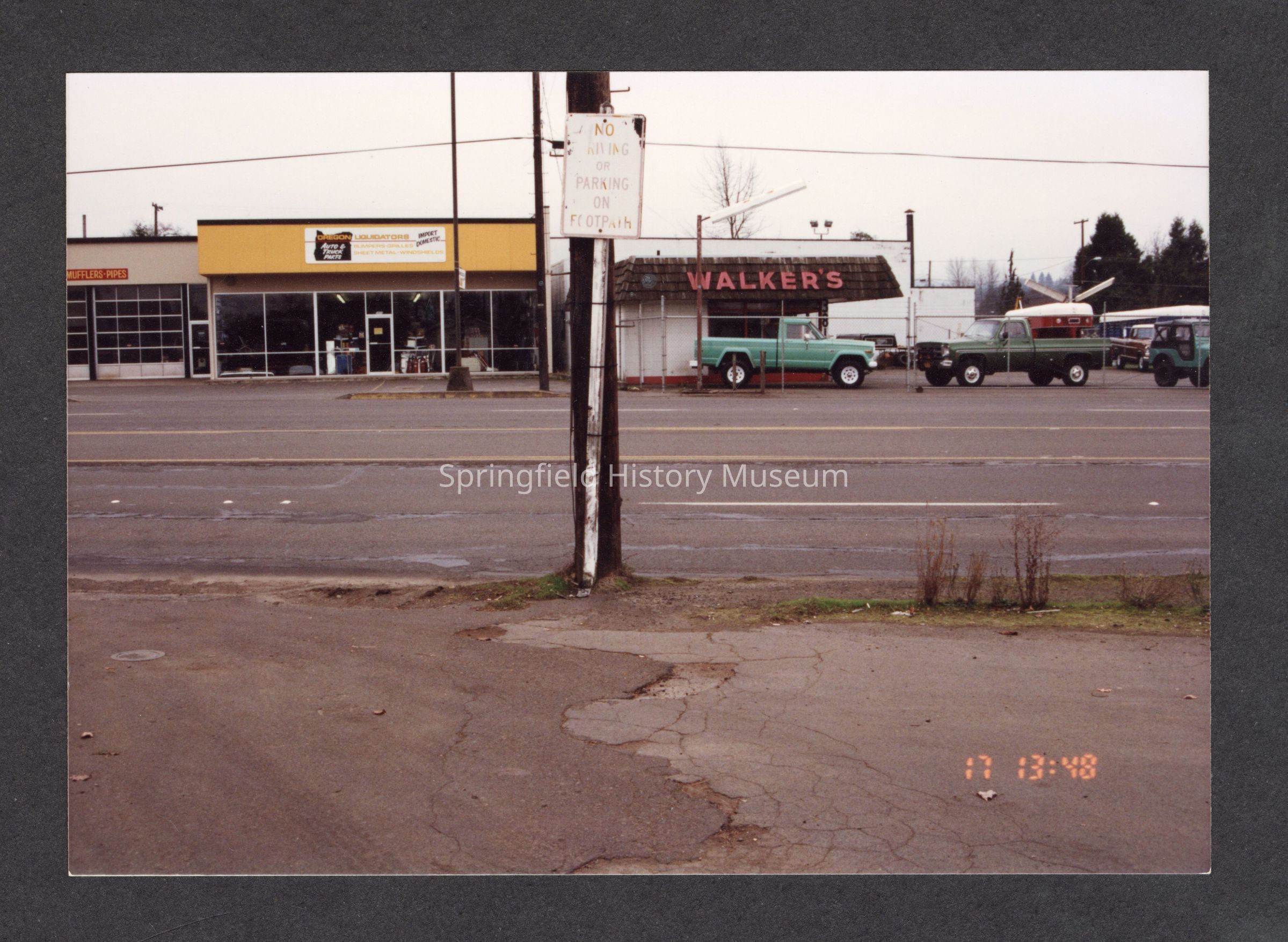 Color photograph of view of car lot on Franklin Blvd. where LTD (Lane Transit District) bus stop is today, looking south. Printed on bottom right, "17 13:48." Oregon Liquidators and Walker's visible across Franklin.Collection