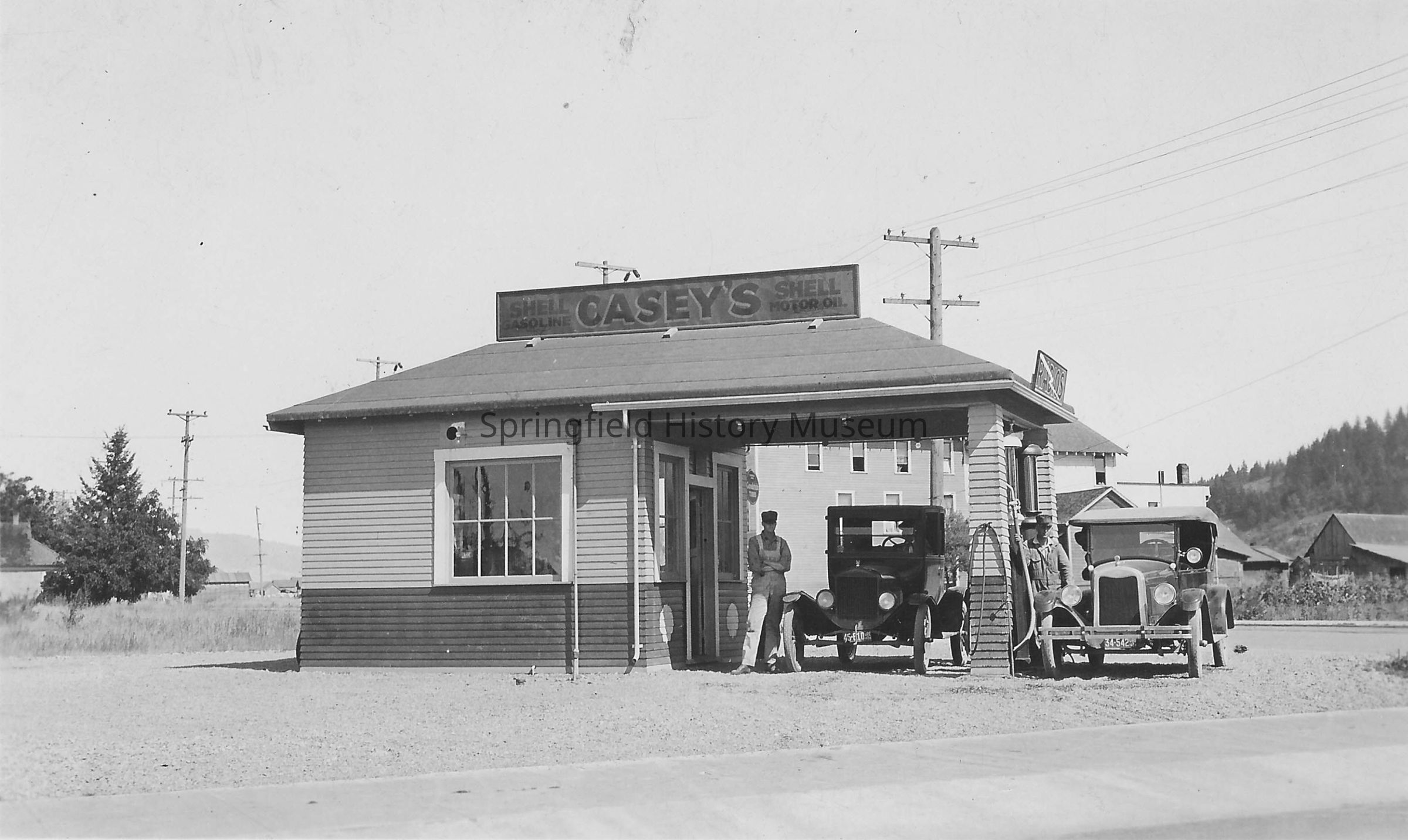 Business & Industry, Transportation, Casey's Shell Service Station, George Carson, Gasoline, Motor Oil, Gas Station, Cars, Automobile, Business, Business & Industry--Casey's Shell Service Station, Business & Industry--Personnel, Springfield--Streets--Main Street, Springfield---Streets--7th Street, Transportation--Motor Vehicles--Cars
