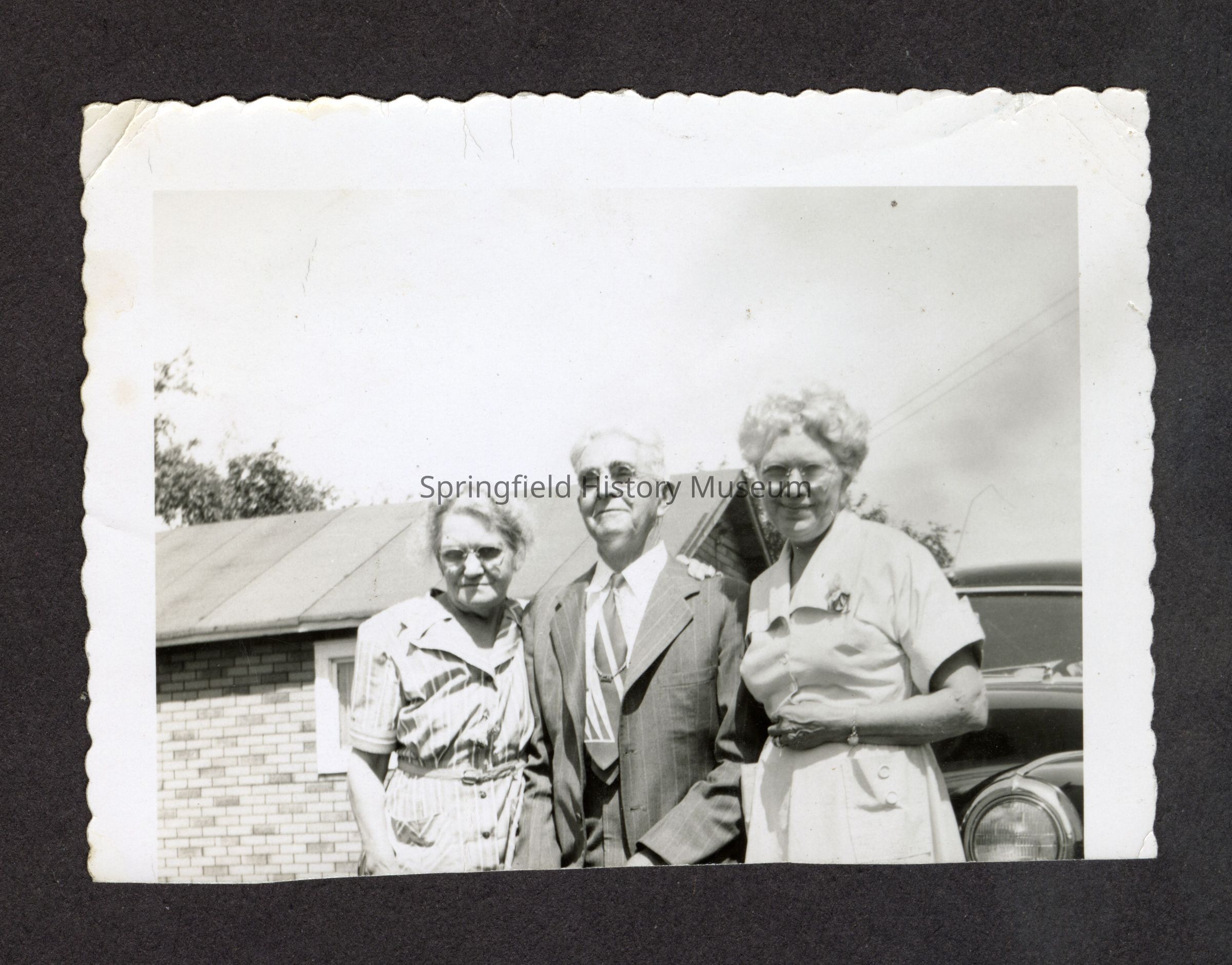 Photograph of Charles H Myers and possibly his sisters, undated circa 1940. Brick house in background.