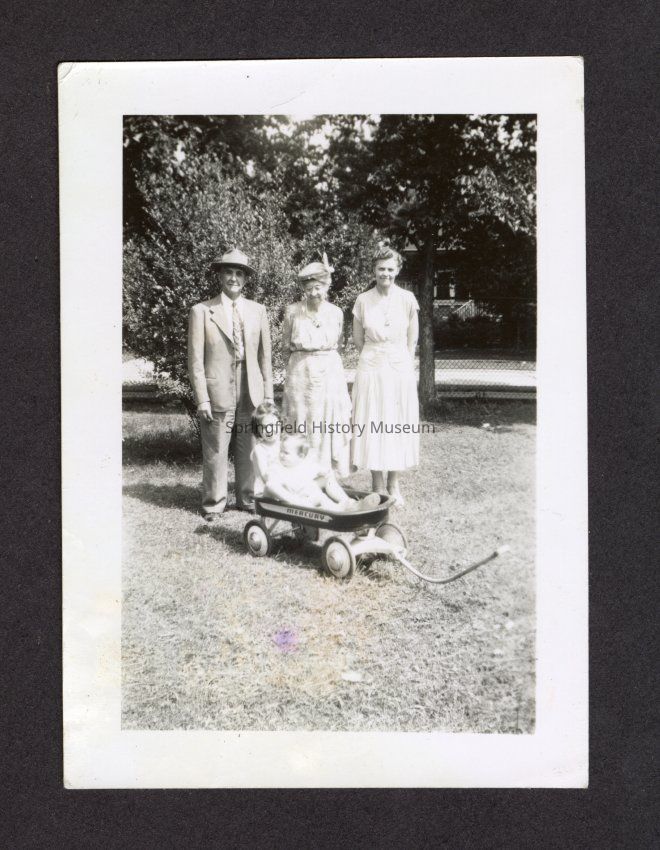 Photograph of possible Doris Myers (on the right), possibly Hattie and Charles Myers and two children. Undated, circa 1940.(1940s Mercury wagon model)Photograph Details
