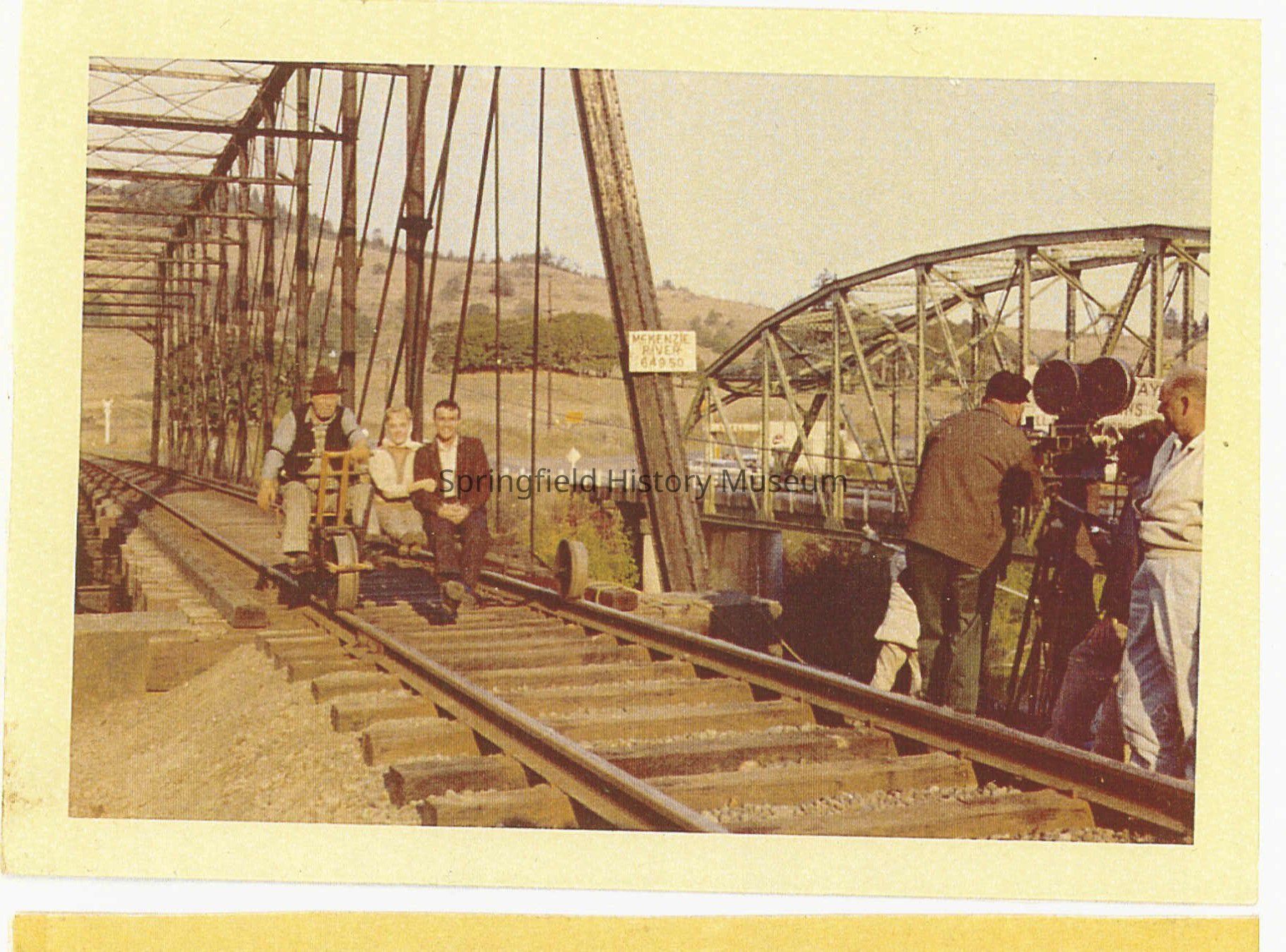 Photograph of the filming of "Chartroose Caboose" on the Southern Pacific bridge over the McKenzie river with Hayden Bridge in the background. Edgar Buchanan on bridge with two unidentified actors, around 1960. "Chartreuse Caboose" movie was filmed in Springfield on the Southern Pacific Railroad, Marcola branch. Photographer Don Henderer was a railroad worker.Photograph Details