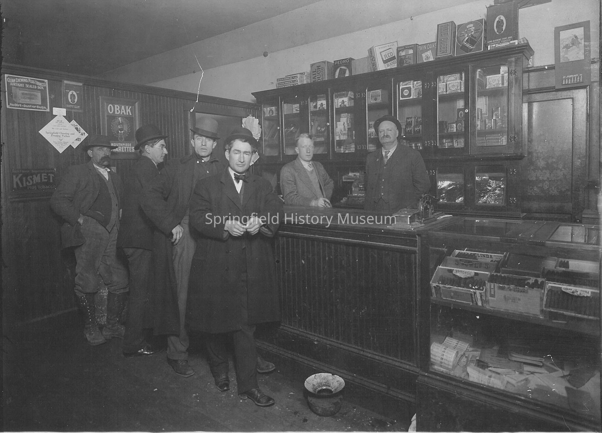 Photograph of interior of Men's cigar store taken around 1910 or 1911. Two men are behind counter and four customers are in front. A spittoon is on the floor.