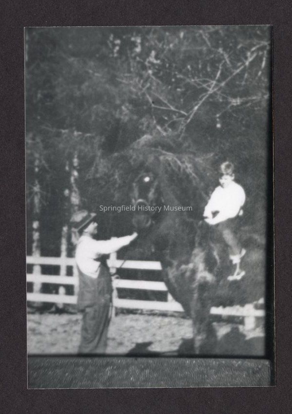 Photograph of Clarence and Roy Belknap, one boy is on a horse, the other is next to the horse