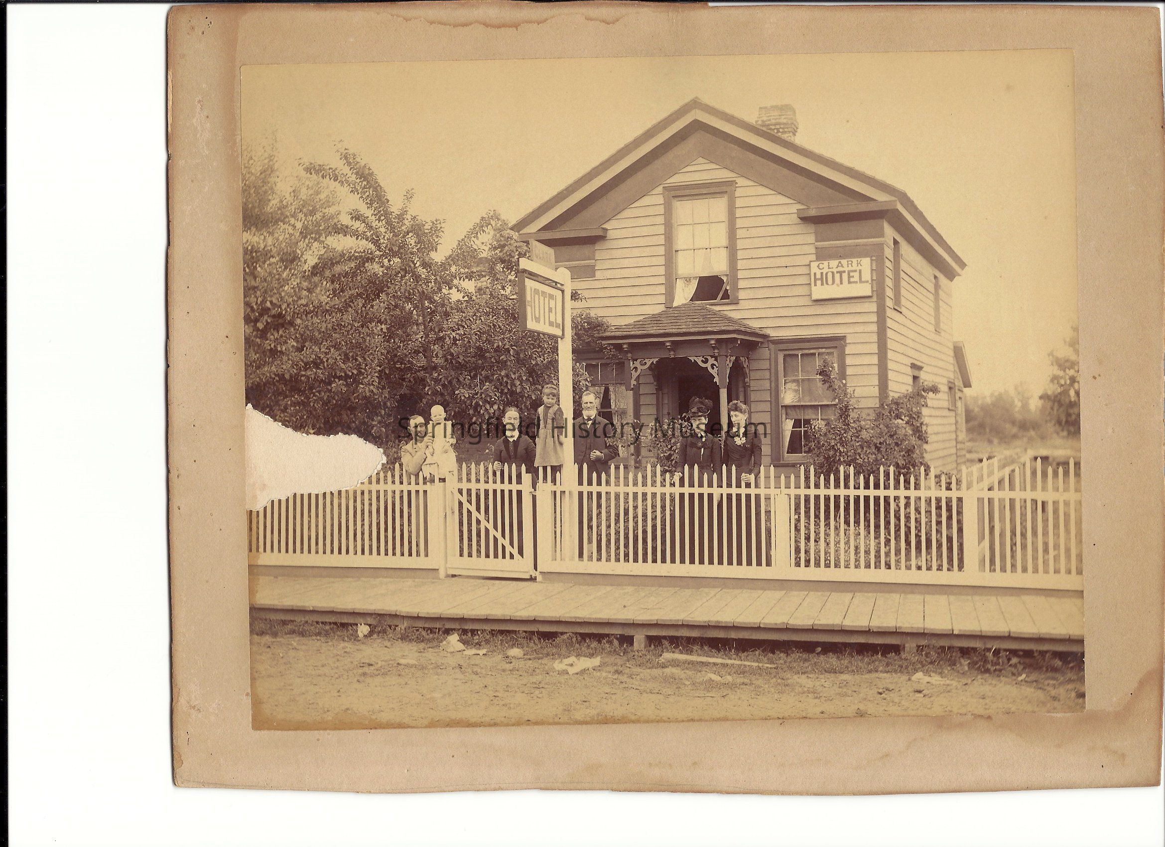 Clark Hotel, first Springfield hotel. Two story house with sign on upper story and picket fence. Seven people including two small children are standing behind fence.