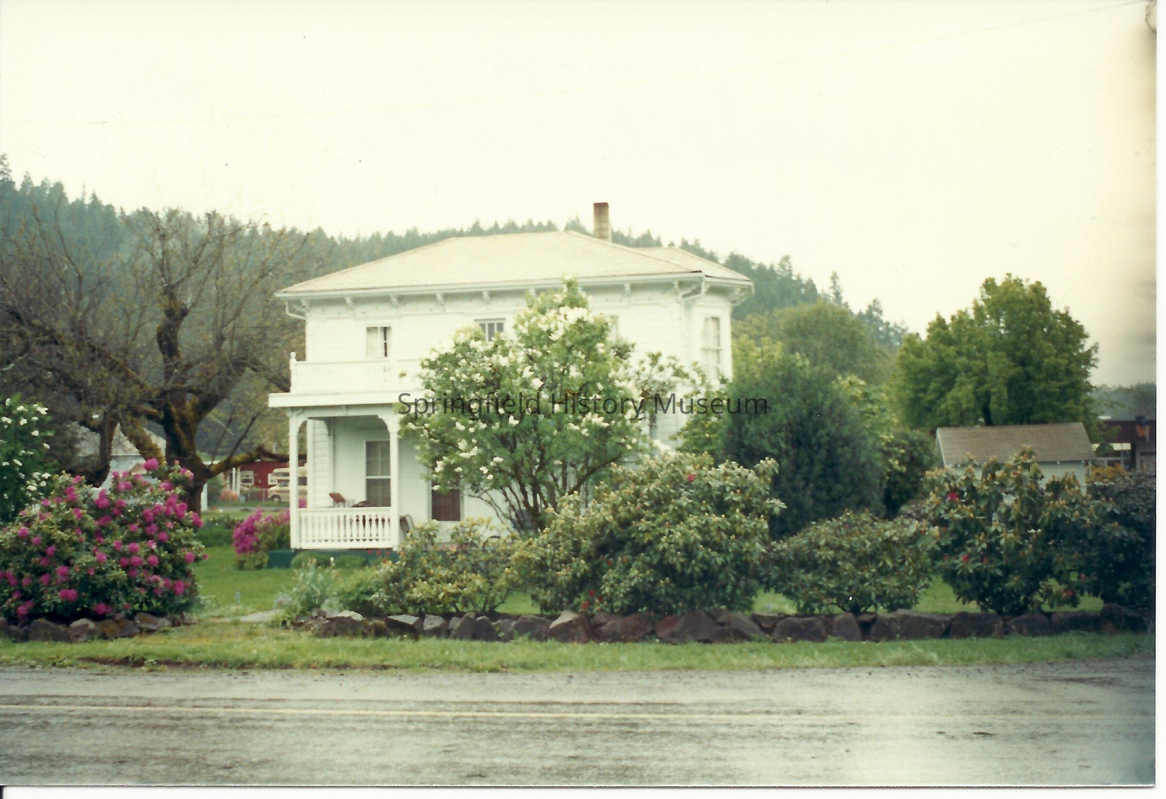 Photograph of white house with bushed and a tree in front of it, in Marcola, Oregon, undated
