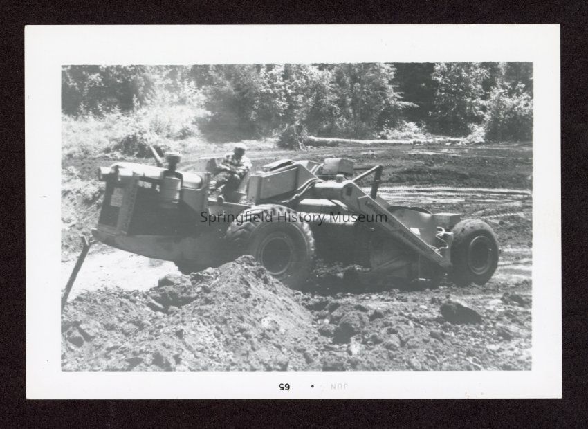 Black and white photograph of man on machine moving dirt, putting in foundation for reservoir tank at an unknown location near Springfield, June 1965.Collection