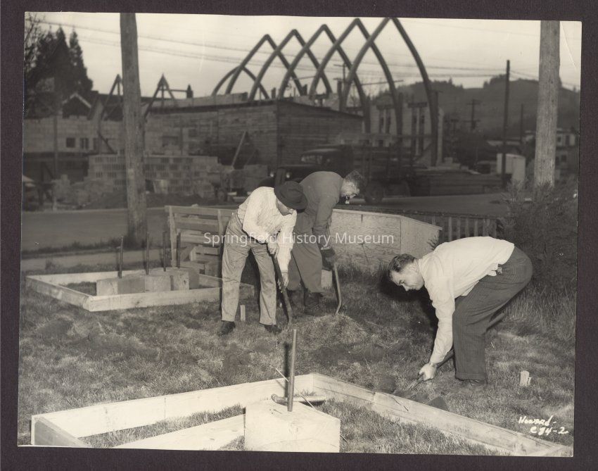 Construction, Buildings, Construction, First Christian Church, Springfield City Hall, A Street, 4th Street, Horseshoe, Construction--Buildings--First Christian Church, Construction--Personnel, Government--Buildings--Springfield City Hall, Clubs & Organizations--Ladies Civic Club, Springfield--Streets--A Street, Springfield--Streets--4th Street