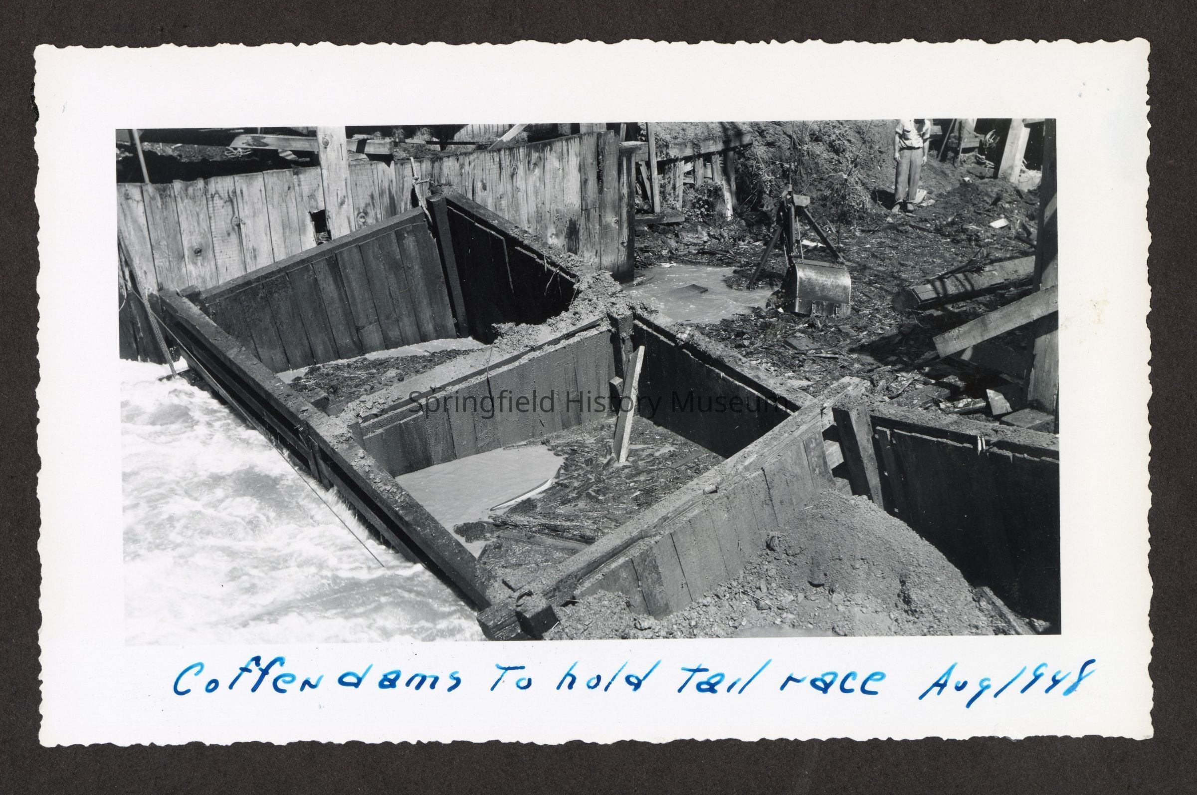 Photograph of the construction of new dam at Booth-Kelly Lumber Mill, on bottom in pen: "Coffen dams to hold trail race, Aug 1948"