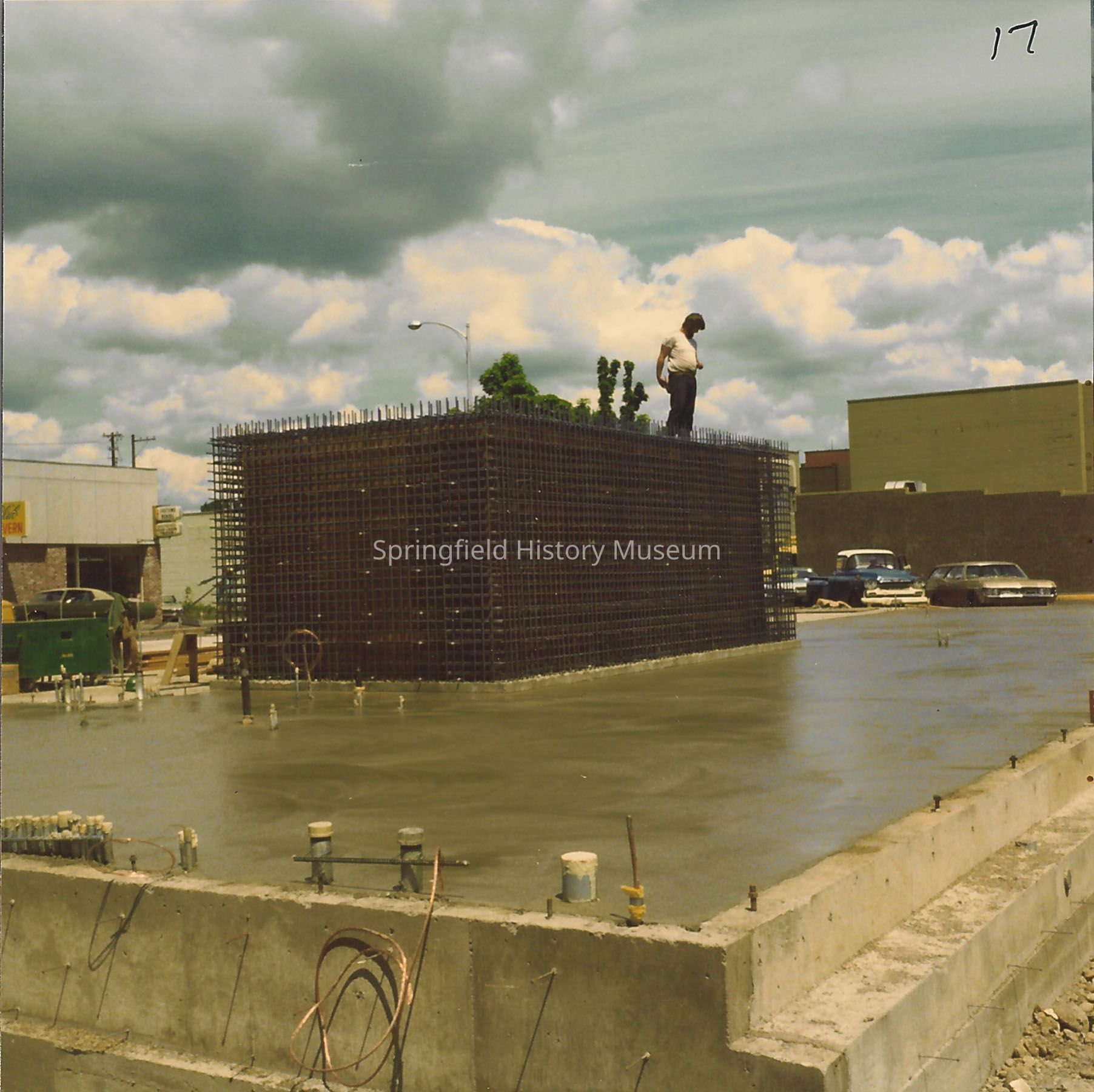 The foundation and vault construction on the new U.S. Bank building on 4th and Main Streets; April, 1976. One man standing on what is to be the vault for the new bank building.