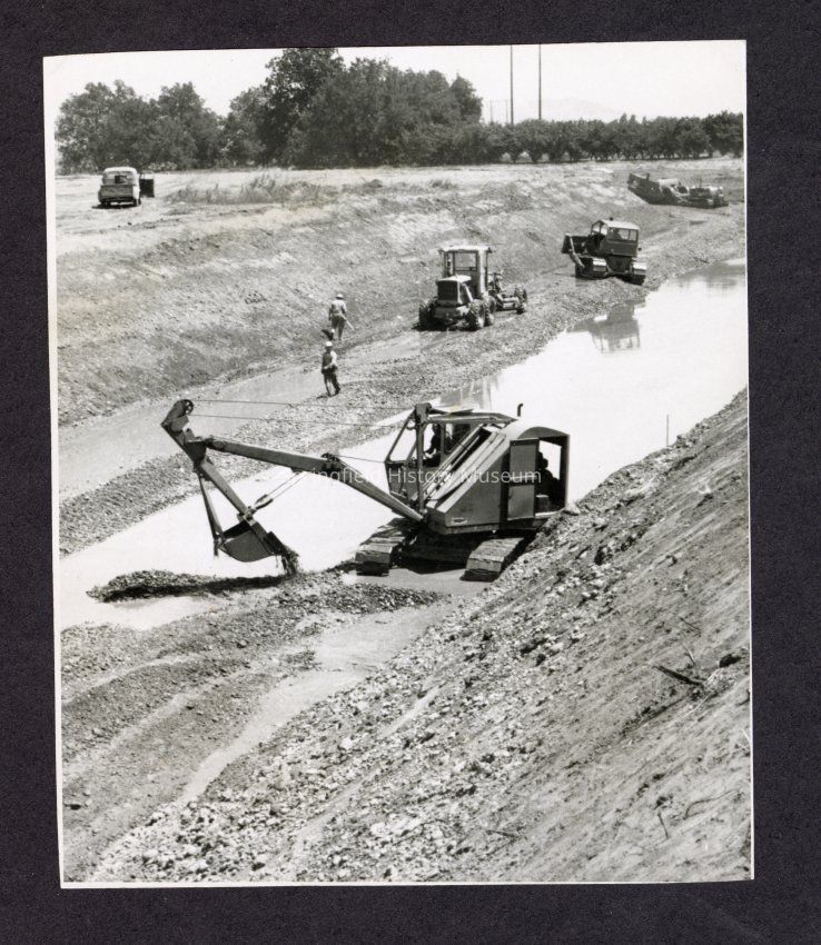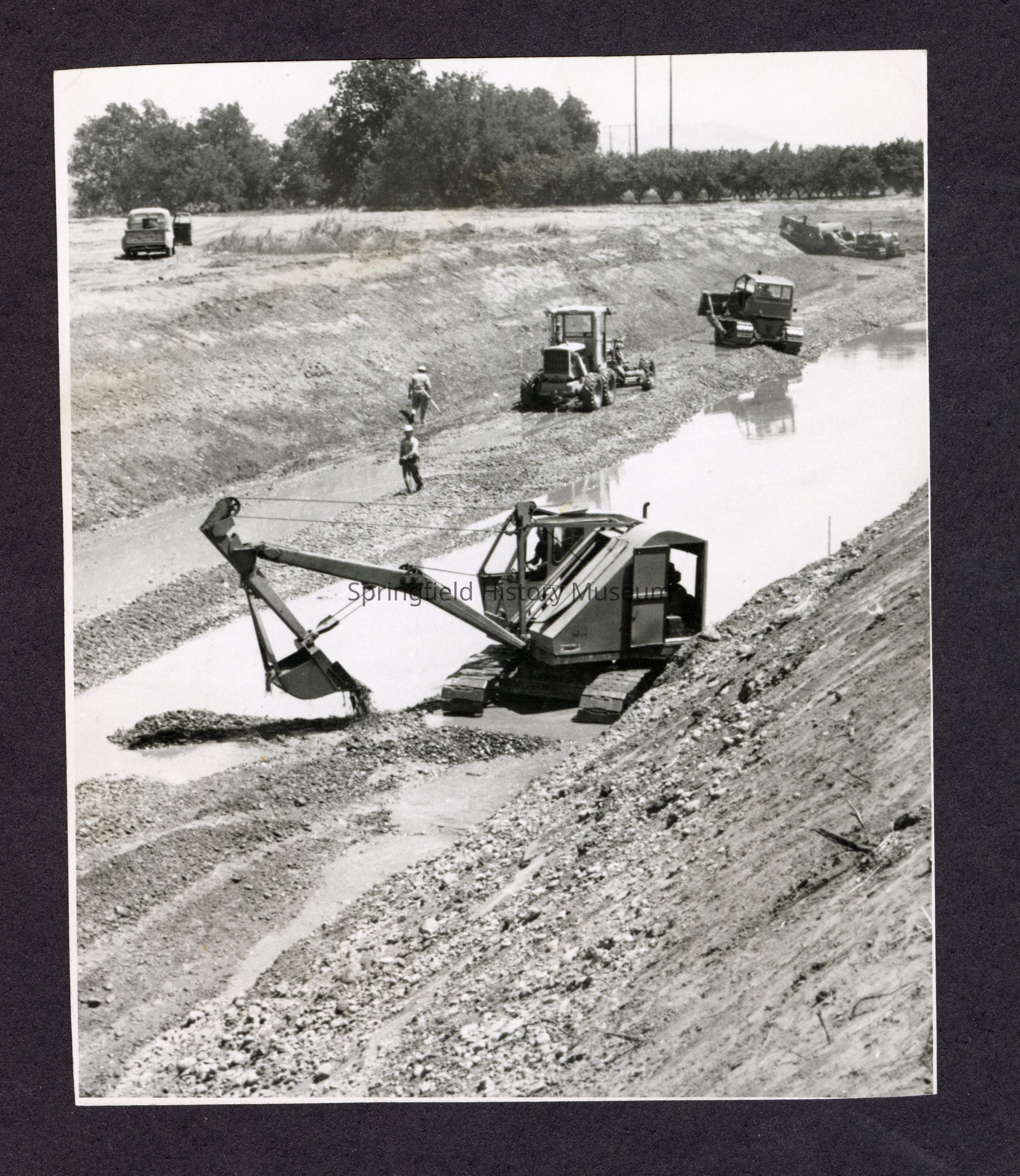 Black and white photograph of construction work digging out a section of field. Two men and four machines are in the depression, which has standing water. Above them, in the background, is a truck with its door open and a filbert orchard. Undated.Collection