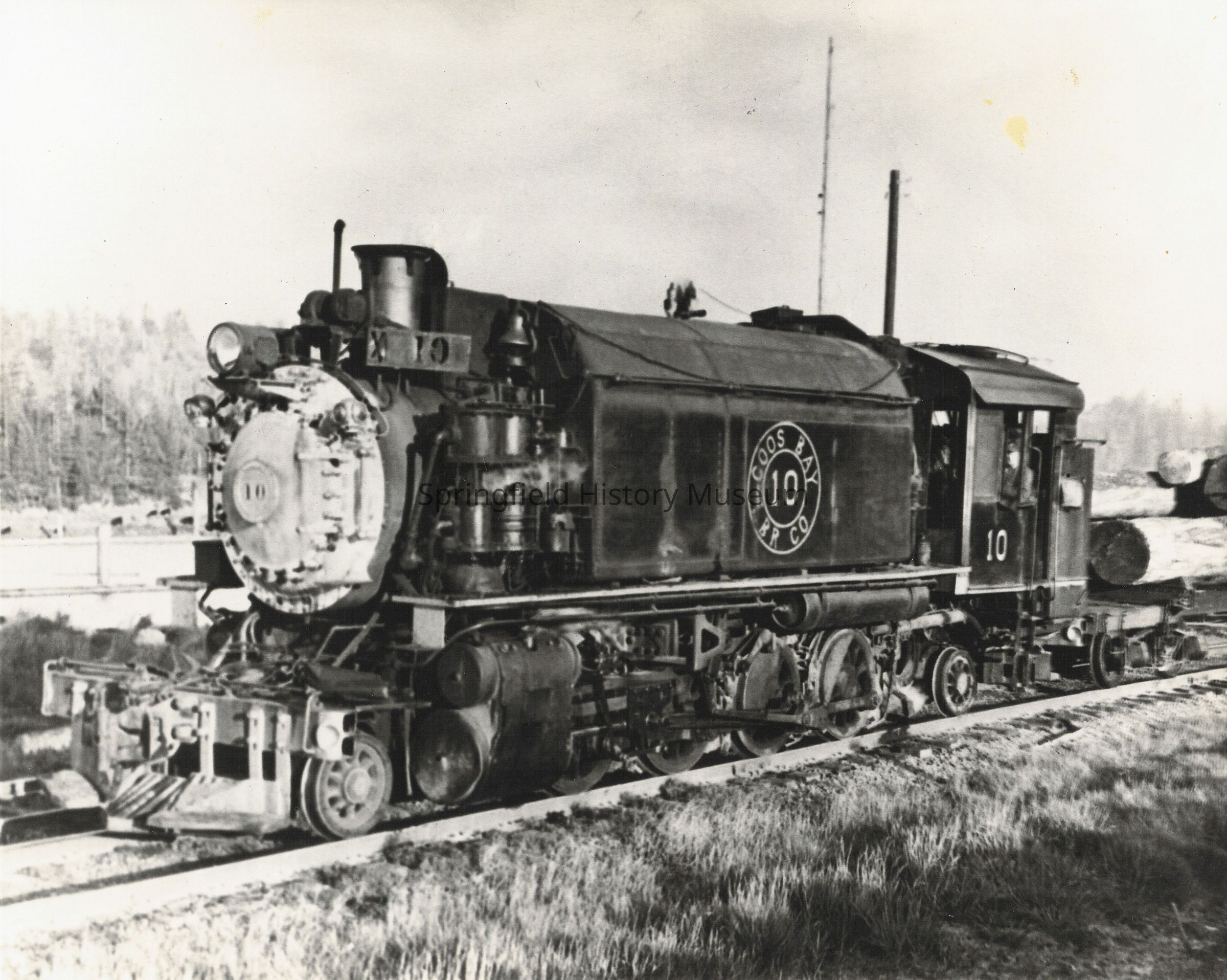 A Coos Bay Railroad Company steam engine, #10, hauling logs; no date.Collection