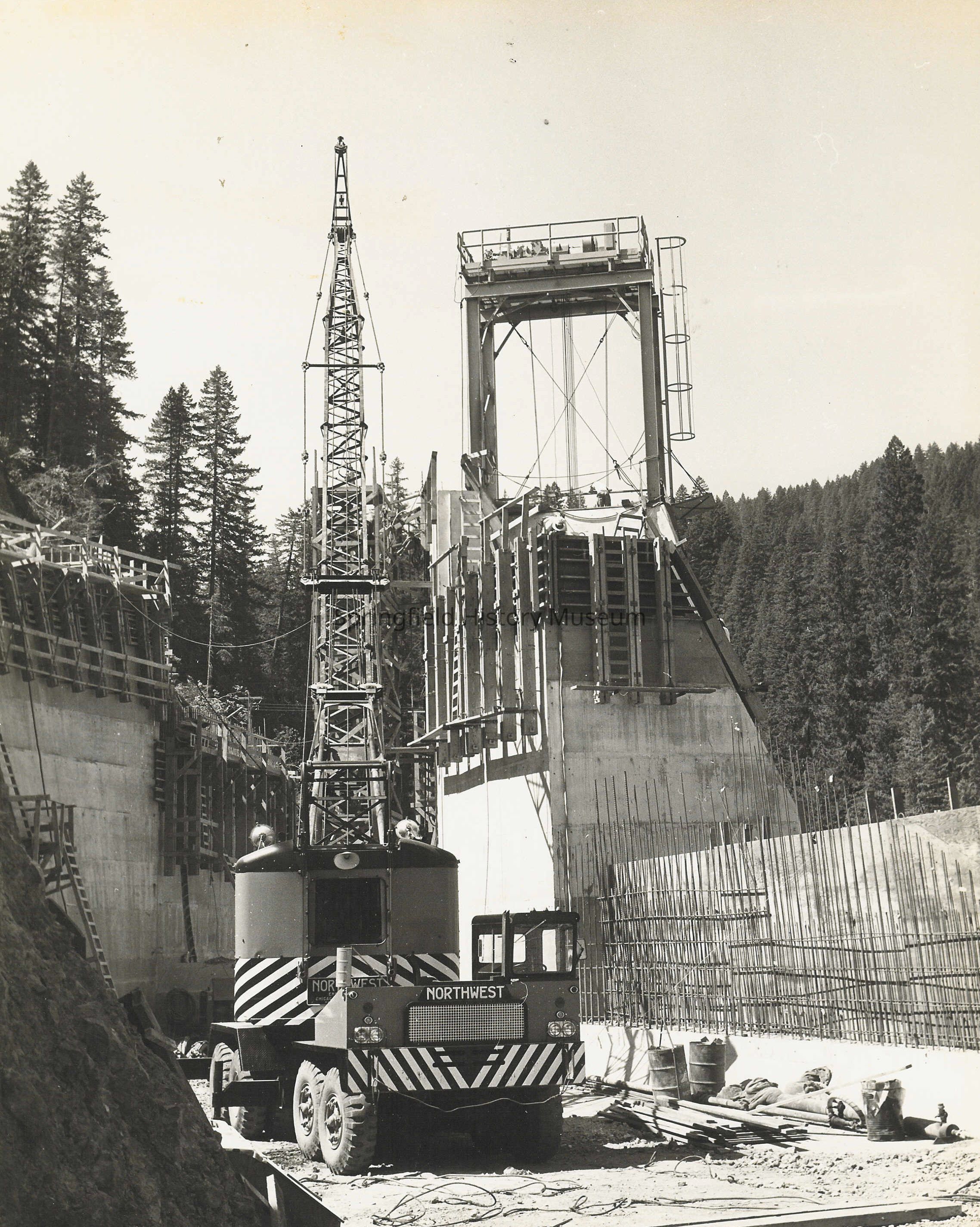 Cougar dam construction with a boom in foreground. Photographer, Phil Grenon, Register Guard