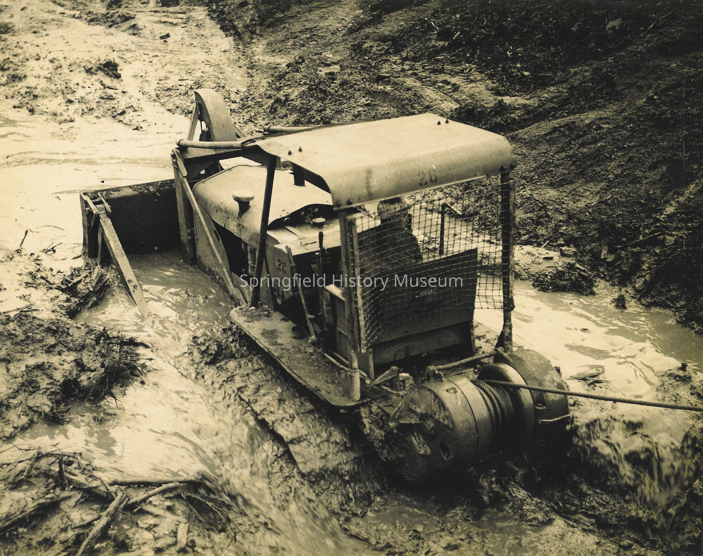 Cougar dam construction, small cat in deep mud. circa 1956.