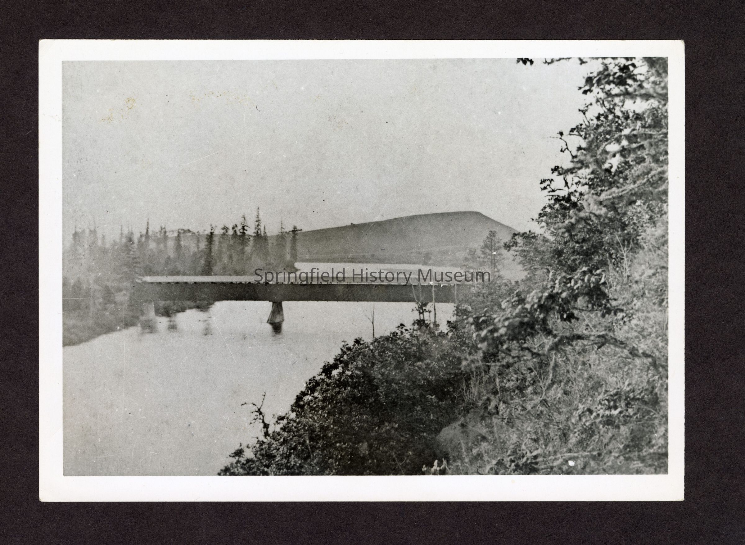 Covered wagon bridge over the Willamette river between Springflield and Glenwood. Written on the back by donor's father Leland Davidson; "Covered Bridge between Springfield and Glenwood taken in 1880's. This brigde washed out in the year 1890, flood. It was replaced by a stell, single span. Francis Mulligan and Charlie Bownam were standing on this bridge moments before it washed out in 1890. Francis Mulligan was father father Deek and Ding Mulligan."Copyright