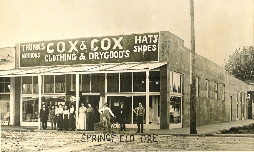 Business & Industry, Cox & Cox Clothing & Drygoods Store, Main Street, 5th Street, Downtown, Bicycles, Rivett Building, Mercantile Store, Our Sewing Room, Business & Industry--Cox & Cox Clothing & Drygoods Store, Buildings--Rivett Building, Springfield--Streets--Main Street, Springfield--Streets--5th Street, Street Views--Springfield, Transportation--Bicycles, People--Groups & Individuals
