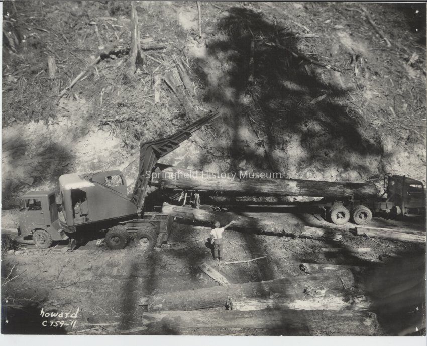 Photograph of crane loading logs on truck. Crane is on the back of a truck with a short crane. There is a man on the ground directing the operation. Marked on the front Howard C759-11. UndatedCollection