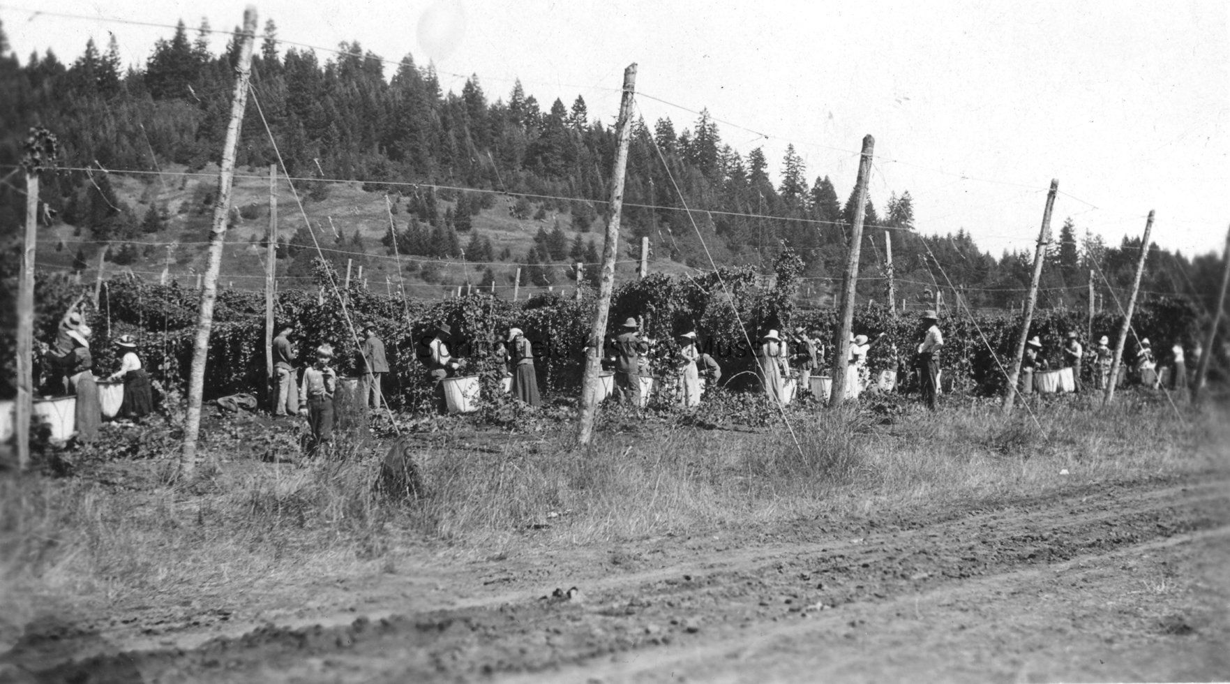 Photograph of hop yards with pickers. No date.