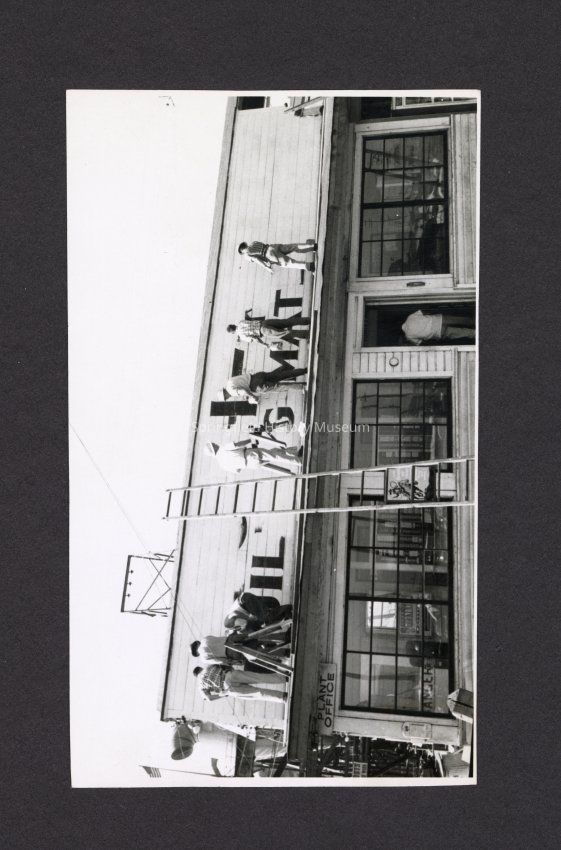 B&W Photo of crew painting new sigh after new owner take over. July 1957.