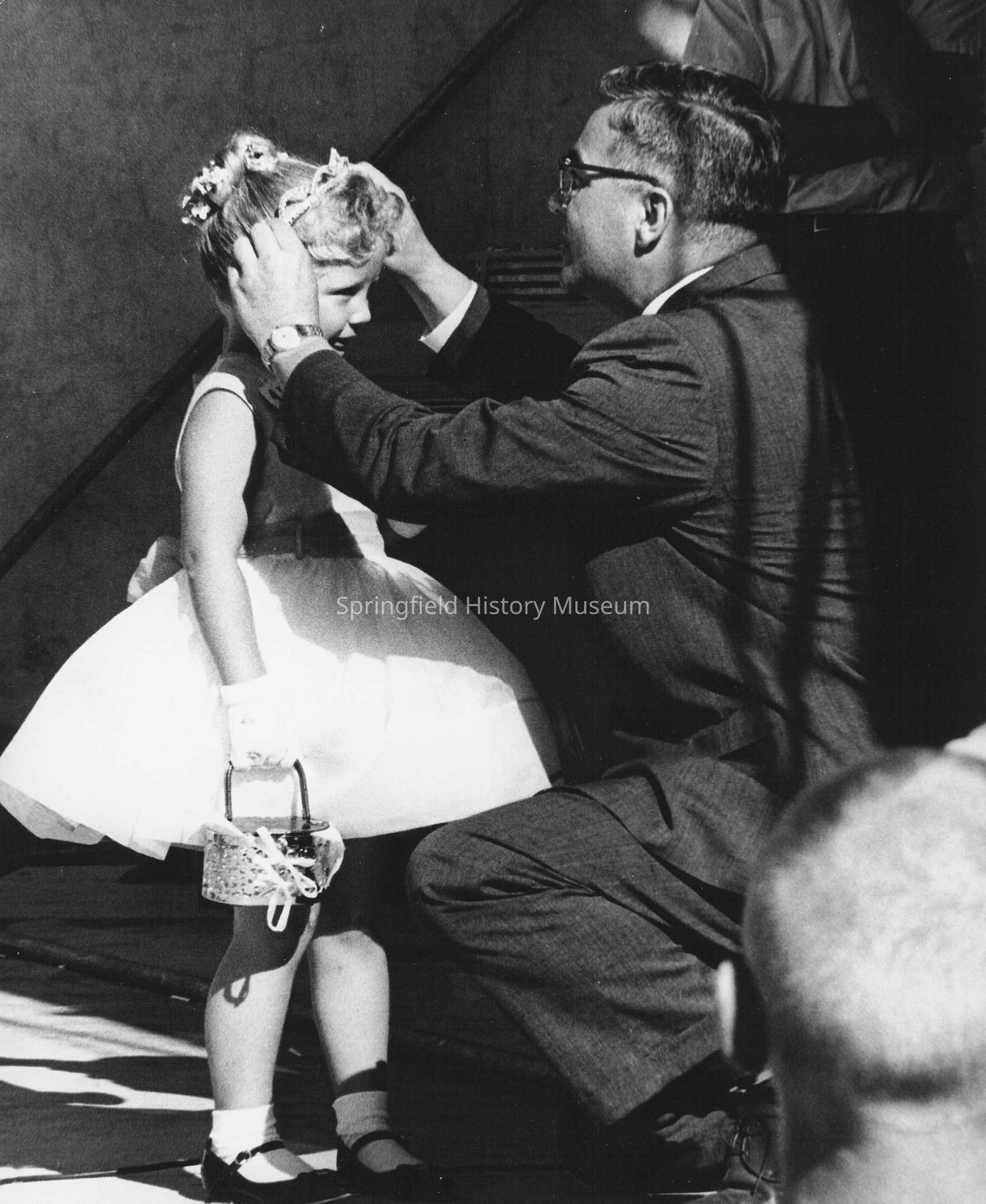 Photograph of an unknown little girl being crowned "Miss Slick Chick" by an unknown man. Girl is wearing light colored, sleeveless dress with white socks and black strap shoes. She is holding a small basket or purse. Date is 1961