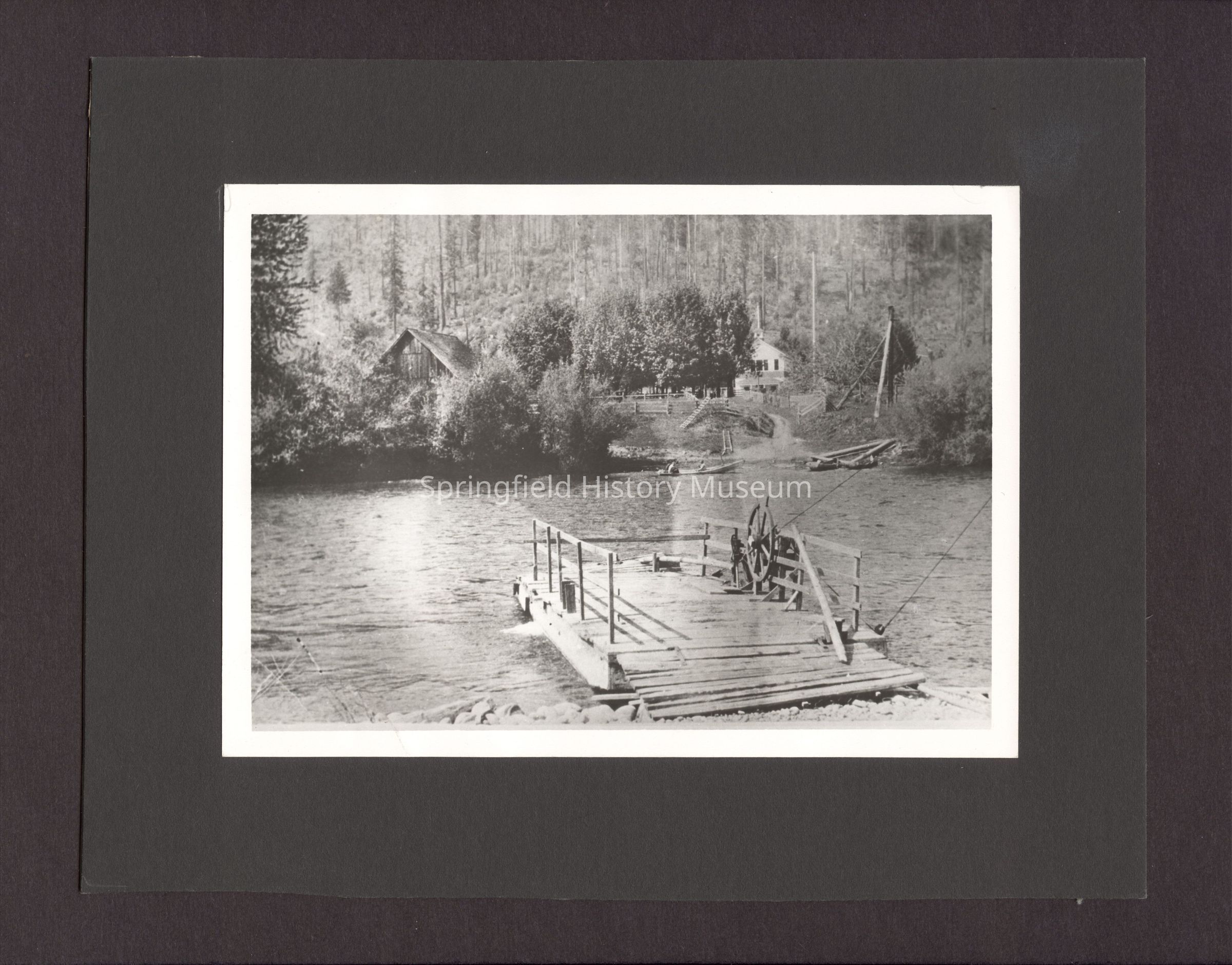 B&W photo on black posterboard of early river ferry, Deerhorn Ferry. 1914.Collection