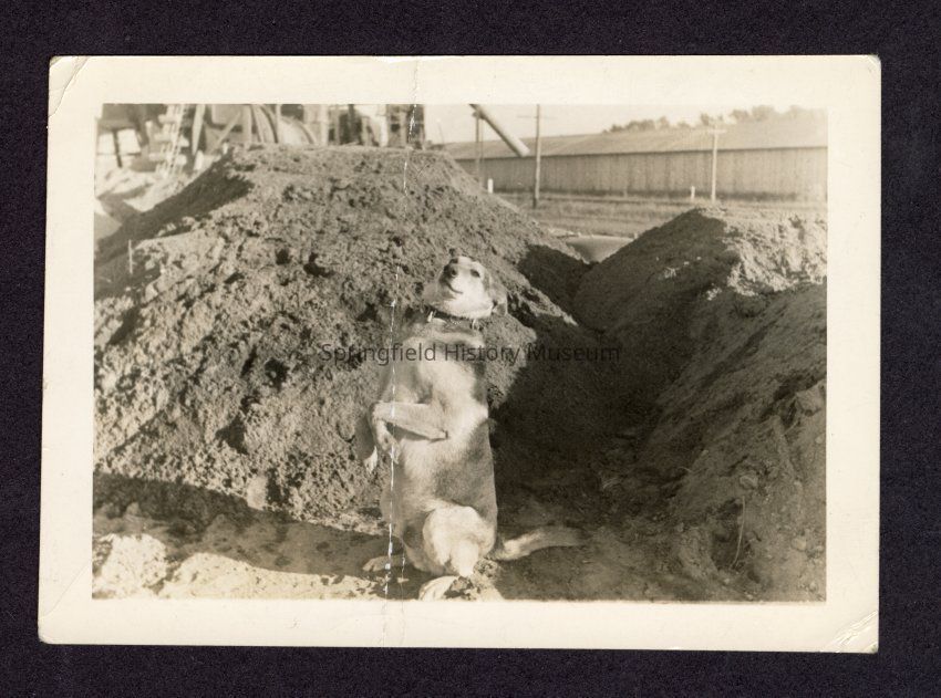 Black and white photo of a dog, possibly at mill or Redi Mix plant, circa 1950.Collection