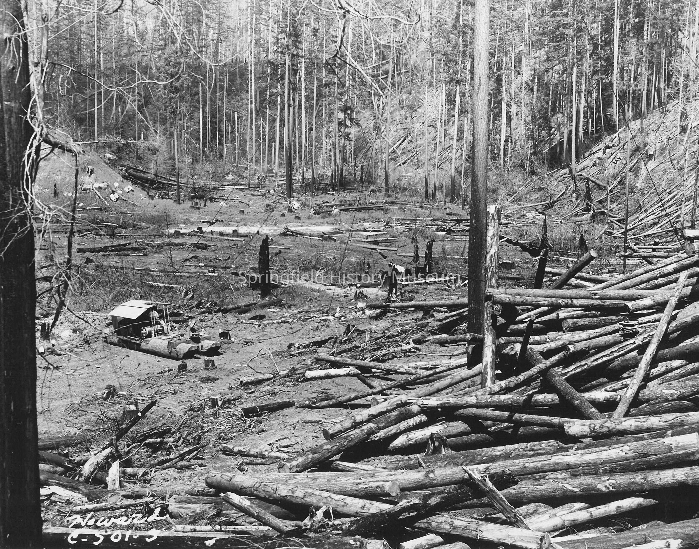 Photograph of Donkey Engine in the middle of fallen and burned treesEntry/Object ID